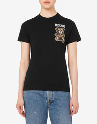ORGANIC COTTON T-SHIRT WITH SMALL LOGO PRINT AND MOSCHINO TEDDY BEAR ON THE FRONT. REGULAR FIT SHORT SLEEVES FABRIC: 100% COTTON CODE: AEF251E 070805411555 FIT MODEL BUST SIZE: 80 CM MODEL HEIGHT: 180 CM MODEL HIPS: 89 CM MODEL SIZE: 40 CM MODEL WAIST: 60 CM