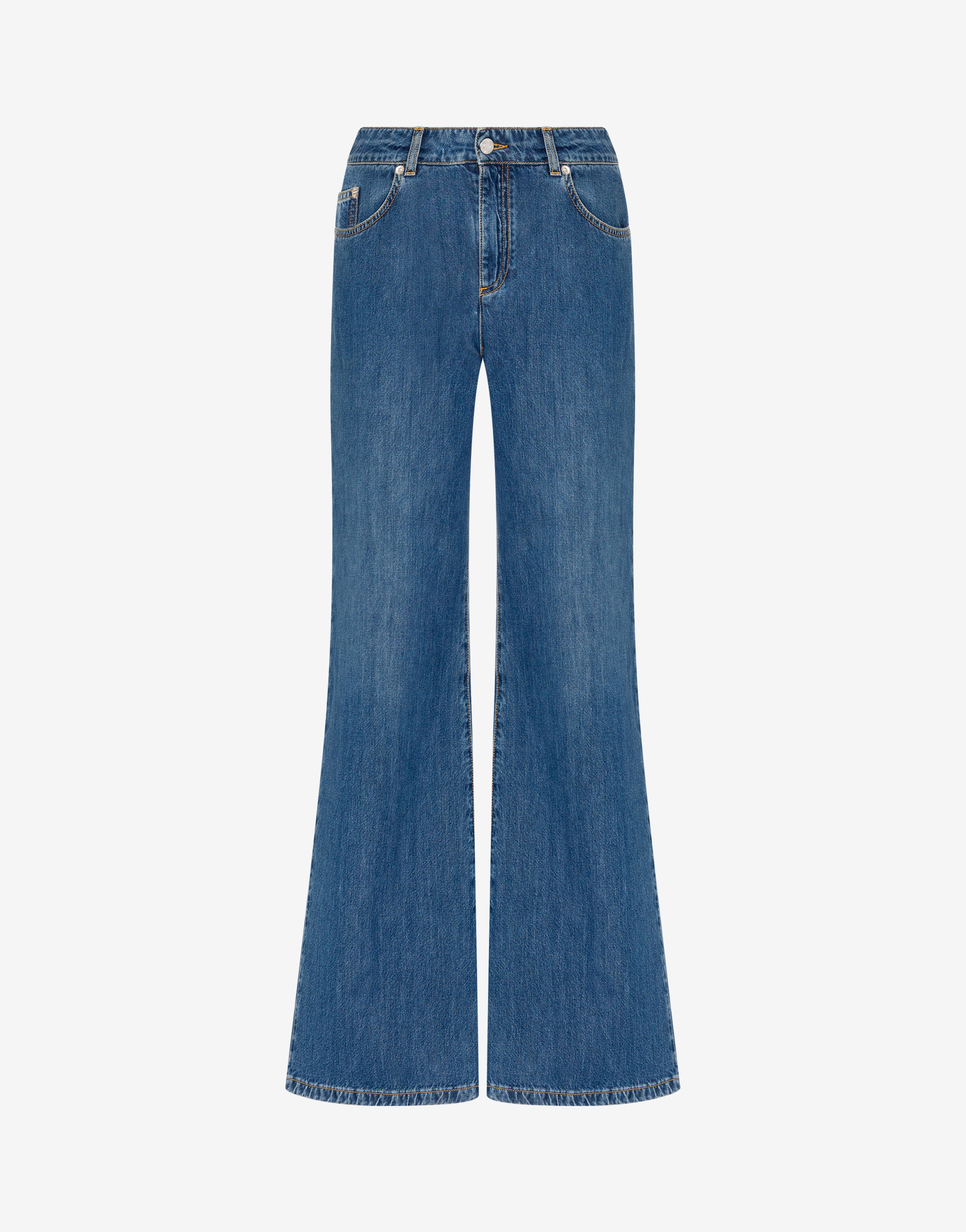 Blue cotton ring denim five-pocket trousers with Classic Pant patch embroidered on the back. - Flare fit - Three front pockets - Belt loop detail at the waist - Two back pockets - Fastening on the front with covered zip and button - Flared fit Fabric:100% Cotton Code: AEF241D 030504220295 FIT - Flare fit - Model bust size : 82 - Model height : 1.78 cm - Model Hips : 88 cm - Model size : 40 - Model waist : 60 cm