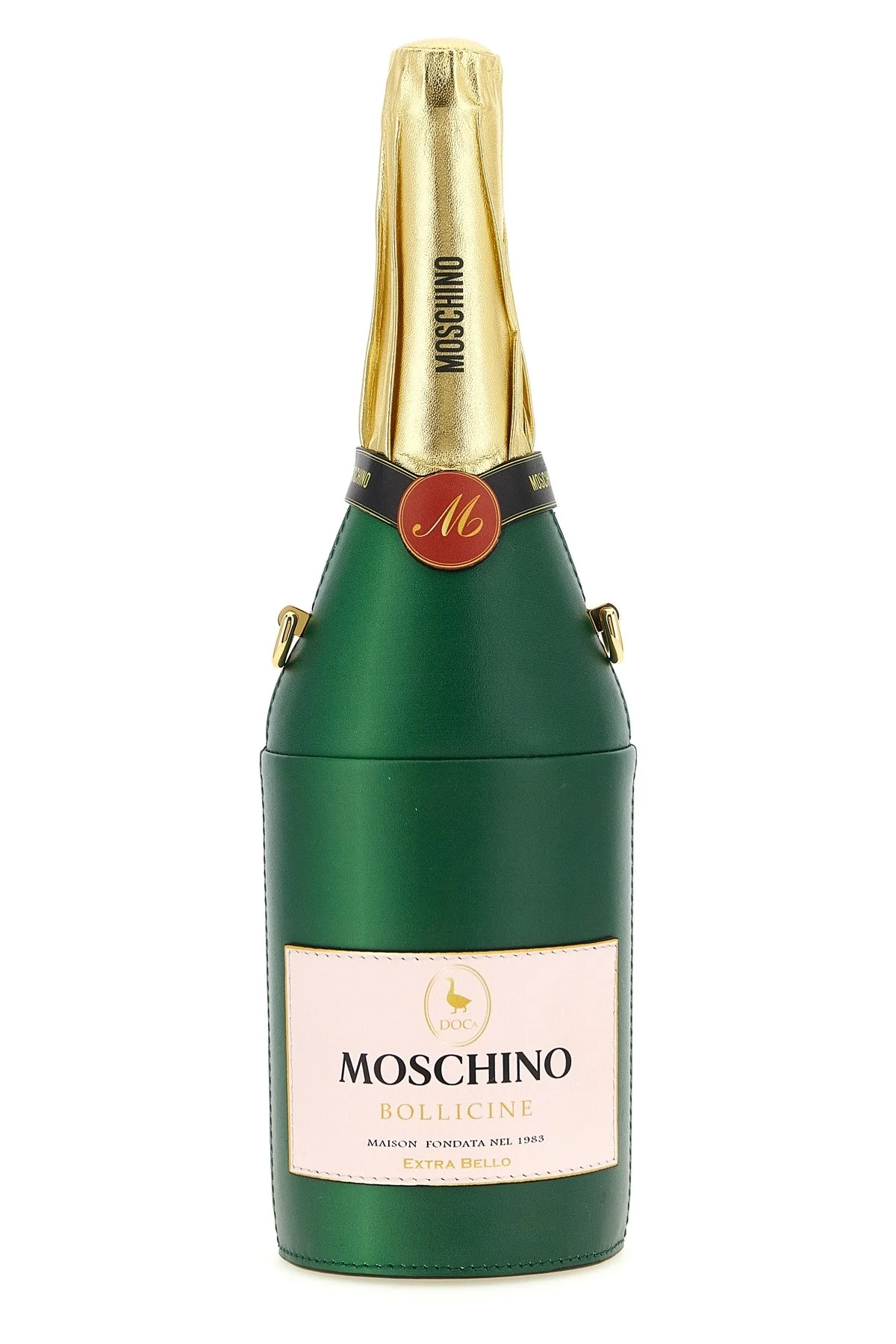 cod. MC4102PP1OOE185A 'Bollicine' leather bottle design crossbody bag with 'Moschino' label, removable chain shoulder strap and zip closure. Color: Multicolor Size & Fit: W 33 X H 13 cm Composition: 80% leather, 20% napa leather Made in: Italy