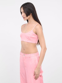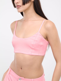 M05CH1NO JEANS bra in pink, bra crop top design, paneled construction, scoop neckline, adjustable spaghetti straps, sleeveless, armscyes, partially open back, side exposed zip closure, straight hem, cropped length, slim fit. Italian Sizing Model is 5'8" wearing size 38. Bust: 32" Waist: 26" Hips: 34.5"