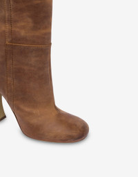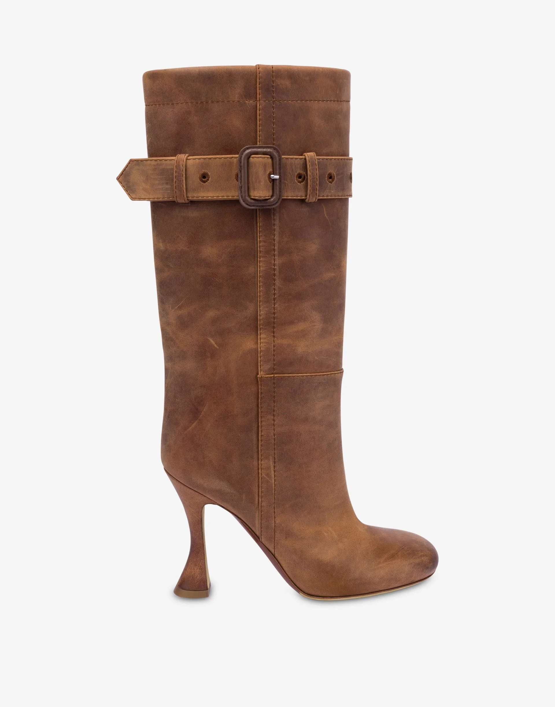 THE FALL/WINTER 2025 PRE-COLLECTION FEATURES DISTRESSED-EFFECT CALF LEATHER TUBE BOOTS WITH BUCKLE AND DETAILS INSPIRED BY ENGLISH TRENCH COATS. THE STRAP IS FULLY REMOVABLE. PRODUCT DETAILS - ADJUSTABLE STRAP WITH METLLO BUCKLE - ROUND TOE - LEATHER LINING - LEATHER SOLE LINING: 100% GOATSKIN - BOTTOM: 100% CALFSKIN - UPPER: 100% CALFSKIN SKU: POLMA2402AC1NMG020B