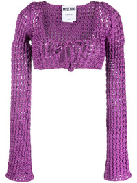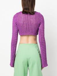 open-knit cropped top Highlights - Violet purple - Cotton - Knitted construction - Chunky knit - Open knit - Scoop neck - Front tie fastening - Bell sleeves - Straight hem - Cropped Made in Italy Composition Cotton 100%, Viscose 75%, Polyamide 25% SIZE & FIT Model measurements Height 5 ft 10 in(1.78 m) Bust/Chest 33.46 in(85 cm) Hips 36.22 in(92 cm) Waist 23.22 in(59 cm) FittingInformation Designed for a close fit throughout Made with a midweight knit, this piece offers some stretch This piece fits true to size – take your usual size