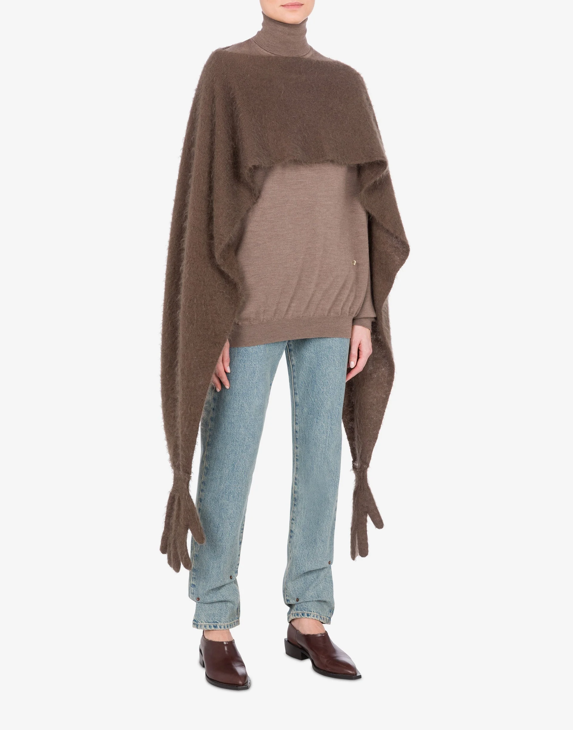 SHORT BRUSHED MOHAIR CAPE WITH GLOVE DETAIL. PRODUCT DETAILS - STRAIGHT NECKLINE - FUNCTIONAL GLOVES FABRIC: 50% MOHAIR, 32% POLYAMIDE, 18% PURE WOOL SKU: AEF242D A338054030103