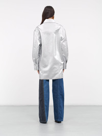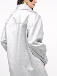 M05CH1NO JEANS jacket in silver, paneled construction, coated fabric, spread collar, front buttoned placket closure, dropped shoulders, long sleeves, double-button barrel cuffs, chest & waist flap pockets, side vents, logo-engraved hardware, straight hem, mini-length, oversized fit. Italian Sizing Model is 5'8" wearing size 40. Bust: 32" Waist: 26" Hips: 34.5"
