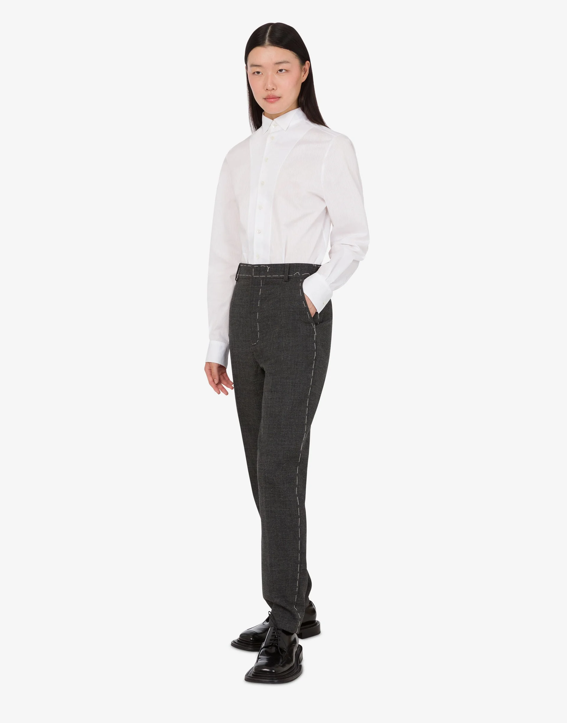 THE FALL/WINTER 2025 COLLECTION FEATURES THE TAILORED-CUT WOOL CANVAS PANT WITH CONTRASTING EMBROIDERED TOPSTITCHING AND GOLD ELECTROPLATED THREAD AND NEEDLE DECORATION ON THE SIDE. PRODUCT DETAILS REGULAR FIT - REGULAR WAIST - TWO SIDE POCKETS - BELT LOOPS AT WAIST - BACK POCKET WITH BUTTON - ZIP AND HOOK CLOSURE AT FRONT FABRIC: 100% WOOL - LINING: 60% CELLULOSE ACETATE, 40% CUPRO SKU: AEF252D A030454173500