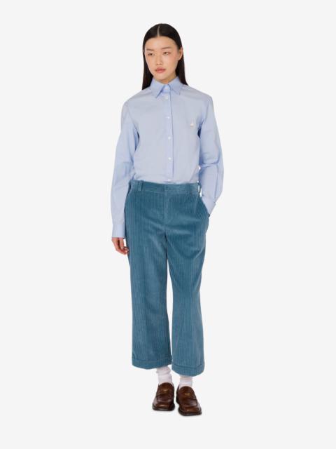THE FALL/WINTER 2025 PRE-COLLECTION FEATURES THE CROP PANT IN CORDUROY COTTON VELVET WITH LEATHER LOGO DETAIL APPLIED TO THE BACK POCKET. PRODUCT DETAILS CROPPED FIT - REGULAR WAIST - CENTRAL PLEATS - TWO SIDE POCKETS - BELT LOOPS AT WAIST - BACK POCKET - FRONT CLOSURE WITH COVERED ZIPPER AND HOOK - SEWN LAPELS AT BOTTOM FABRIC: 100% COTTON SKU: AEF252E A032055190103 FITTING & DIMENSIONS - MODEL HEIGHT: 177 CM - MODEL BUST: 81 CM - MODEL WAIST: 63 CM - MODEL HIPS: 92 CM - MODEL SIZE: 40