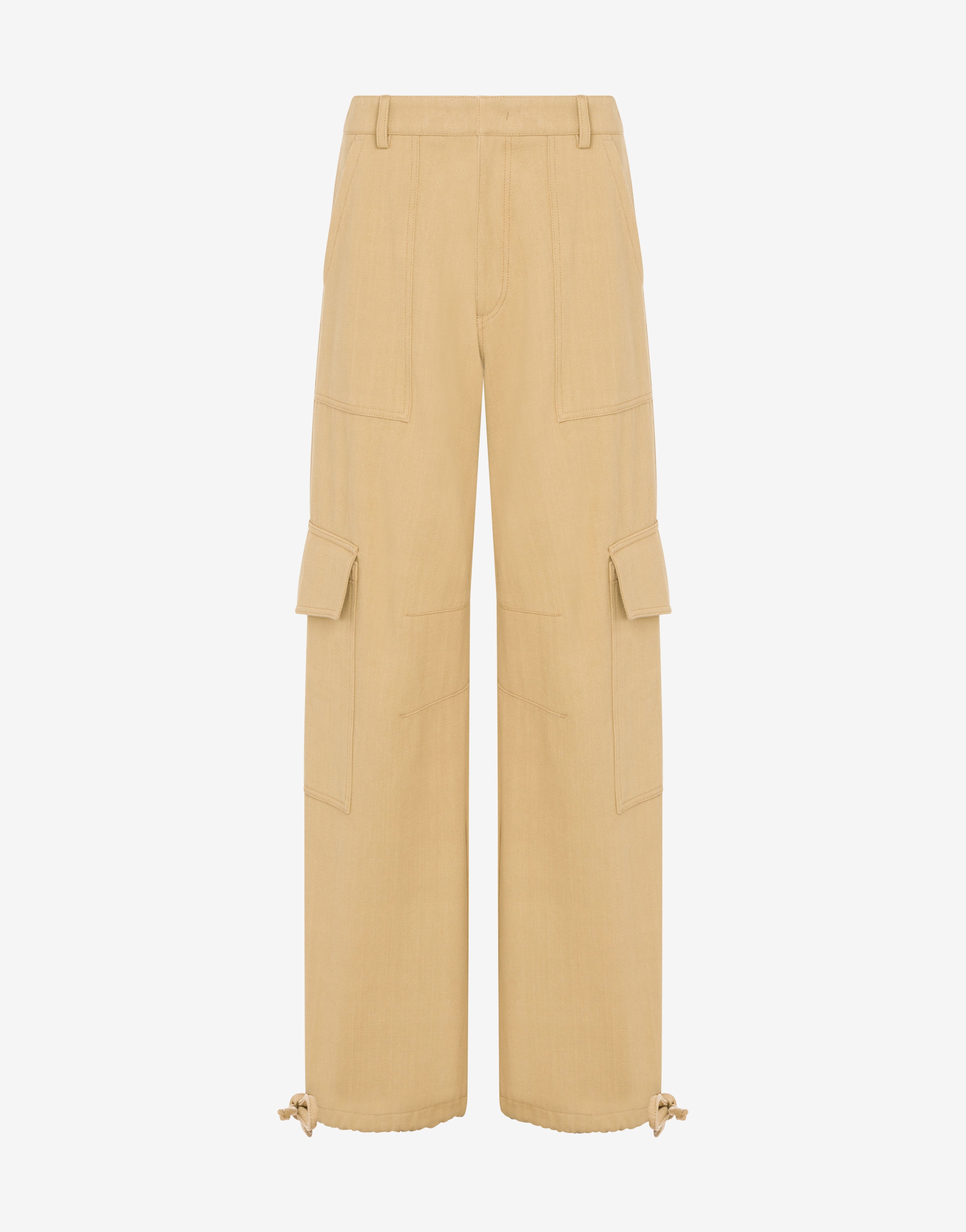Cotton bull oversized trousers with maxi pockets and drawstring at the hem. - Oversize fit - Low waist - Visible stitching - Four side pockets - Two back pockets - Belt loop detail at the waist - Fastening on the front with covered zip and button - Drawstring to adjust the fit on the hem Fabric:100% Cotton Code: AEF241E 032405122081 FIT - Oversize fit - Model bust size : 82 - Model height : 1.78 cm - Model Hips : 88 cm - Model size : 40 - Model waist : 60 cm