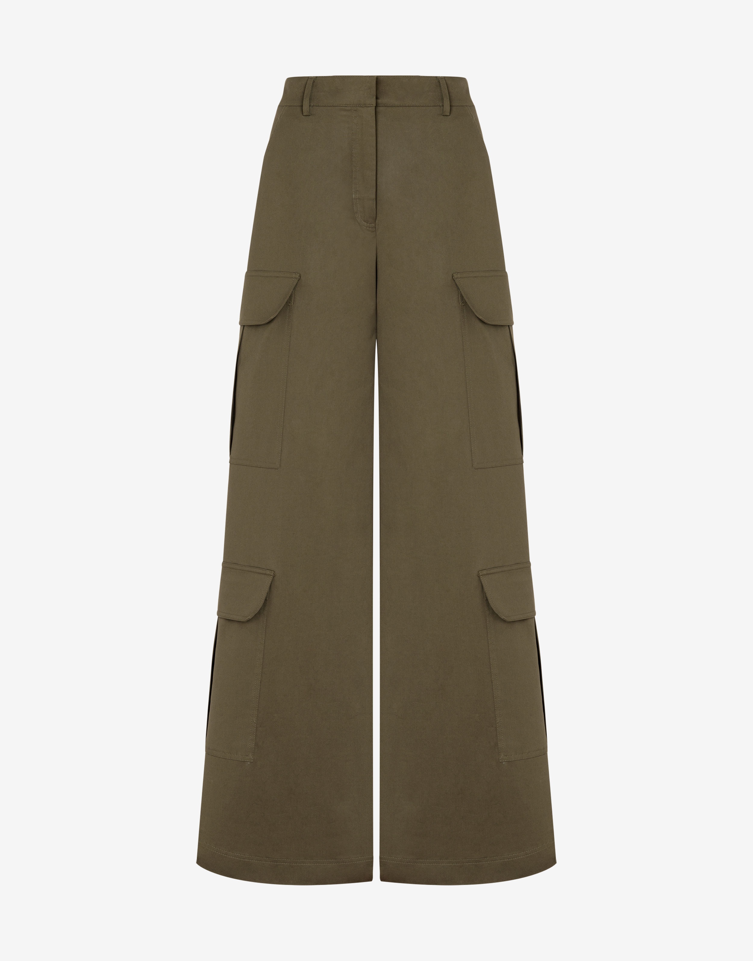 Stretch cotton canvas palazzo trousers with cargo pockets. - A-line Fit - High waist - Two slant pockets - Four maxi cargo pockets at the sides - Belt loop detail at the waist - Fastening on the front with covered zip and concealed hook - Flared fit Fabric:96% Cotton, 4% Elastan Code: AEF241D 030904200440 FIT - A-line Fit - Model bust size : 82 - Model height : 1.78 cm - Model Hips : 88 cm - Model size : 40 - Model waist : 60 cm
