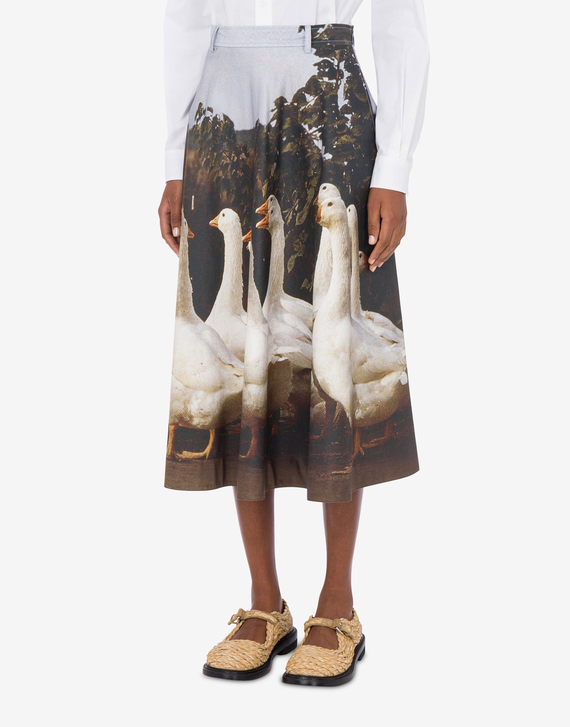 A-LINE COTTON GABARDINE SKIRT, FEATURING A PLAYFUL AND ICONIC GOOSE PRINT. PRODUCT DETAILS A-LINE FIT - PLACED PRINT - REGULAR WAIST - TWO SIDE POCKETS - FLARED - SIDE ZIP CLOSURE - BELT LOOPS AT THE WAIST FABRIC: 100% COTTON SKU: AEF251E A010205531888 FITTING & DIMENSIONS - MODEL HEIGHT: 180 CM - MODEL BUST: 80 CM - MODEL WAIST: 60 CM - MODEL HIPS: 89 CM - MODEL SIZE: 40