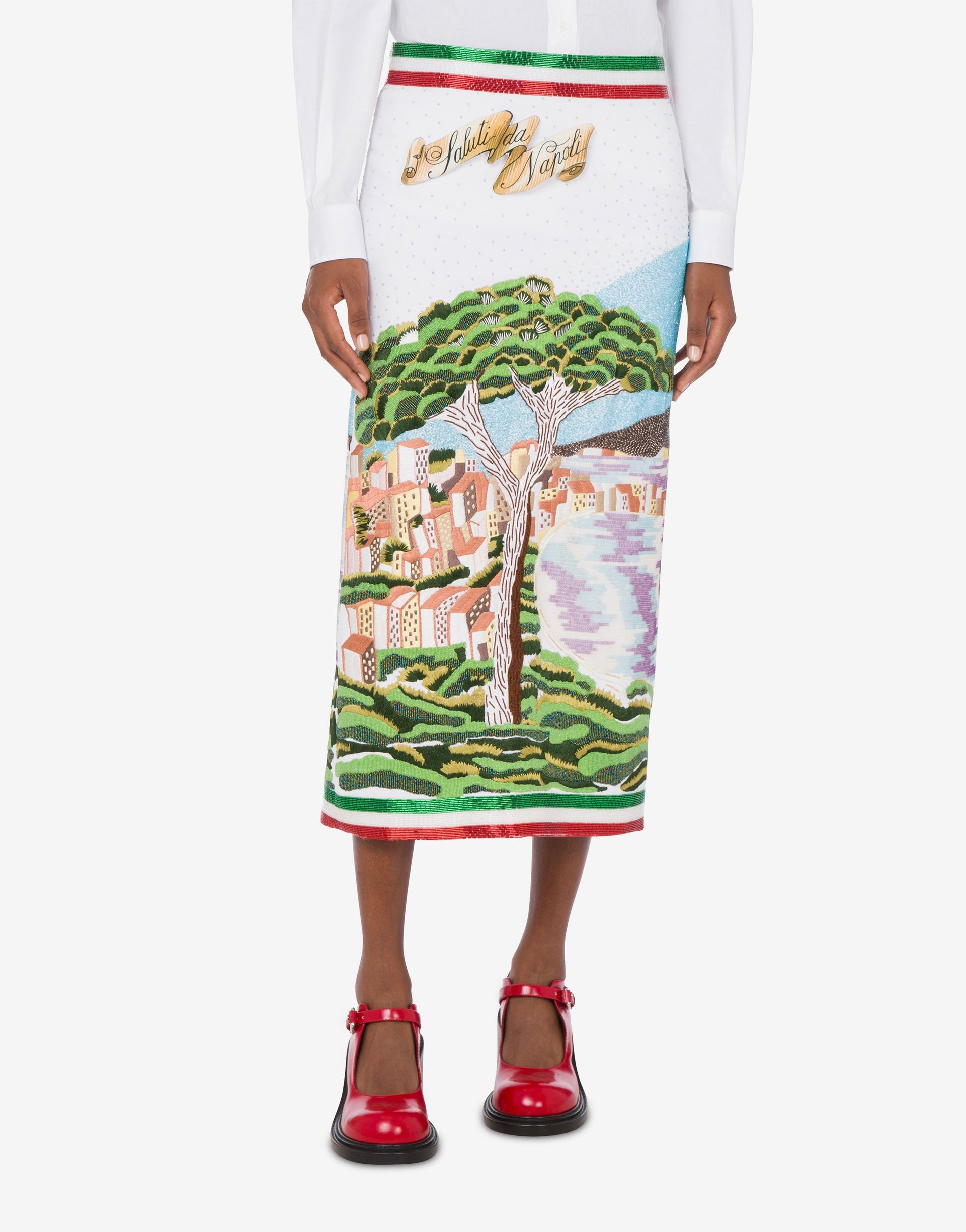 CREPE SKIRT WITH ""GREETINGS FROM NAPLES"" EMBROIDERY