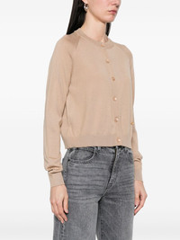 crew-neck cardigan Highlights - Light beige - Front button fastening - Ribbed cuffs and hem - Applique logo - Long raglan sleeves Made in Italy Composition Virgin Wool 70%, Silk 30% SIZE & FIT Model measurements Height 5 ft 10 in(1.78 m) Bust/Chest 33.46 in(85 cm) Hips 36.22 in(92 cm) Waist 23.22 in(59 cm) FittingInformation Designed for a relaxed fit, this piece allows for comfort and movement when worn The ribbed hem offers a close, comfortable fit Made with a lightweight knit, this piece offers some stretch