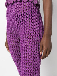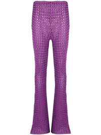 crochet-knit flared trousers purple cotton crochet knit flared design high-waisted floor-length Made in Italy Composition Cotton 100%, Viscose 75%, Polyamide 25% SIZE & FIT Model measurements Height 5 ft 10 in(1.77 m) Bust/Chest 29.92 in(76 cm) Hips 34.25 in(87 cm) Waist 23.62 in(60 cm) FittingInformation This piece fits true to size. We recommend you get your regular size Cut for a close fit Made with a mid-weight fabric Washing instructions Dry Clean Only