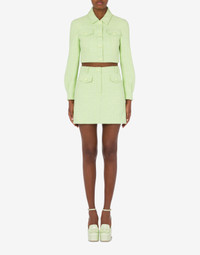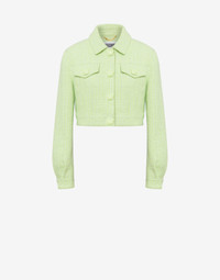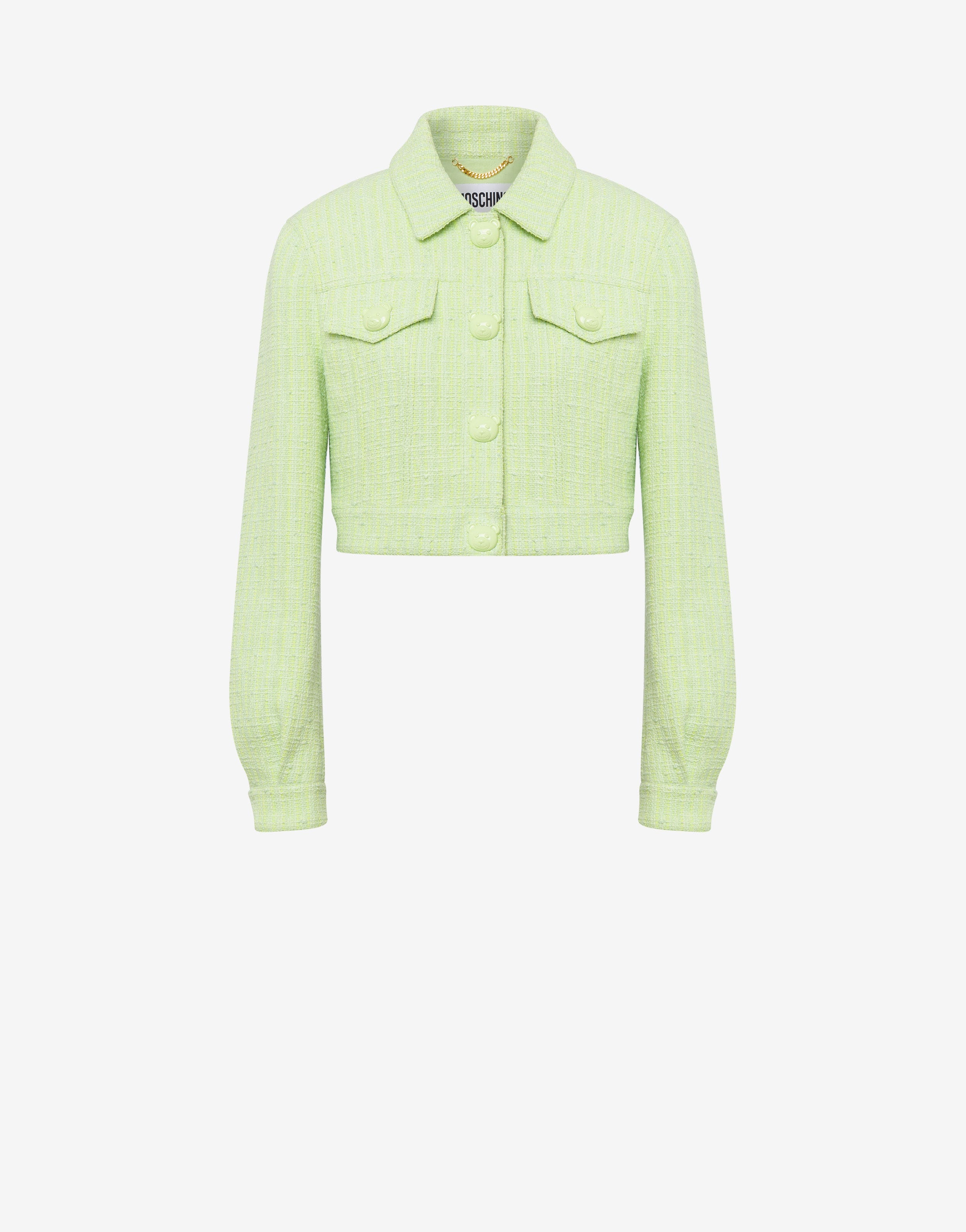 Cropped nylon and cotton tweed jacket with tonal Moschino Teddy Bear-shaped buttons. - Regular fit - Two flap-adorned front pockets with press-stud fastenings - Sleeves with full cuffs - Press-stud on sleeve trims - Front button fastening Fabric:82% Cotton, 18% Polyamide Lining:60% Cellulose acetate, 40% Cupro Code: AEF231E 051305170449 FIT - Regular fit - Model bust size : 82 - Model height : 1.78 cm - Model Hips : 88 cm - Model size : 40 - Model waist : 60 cm