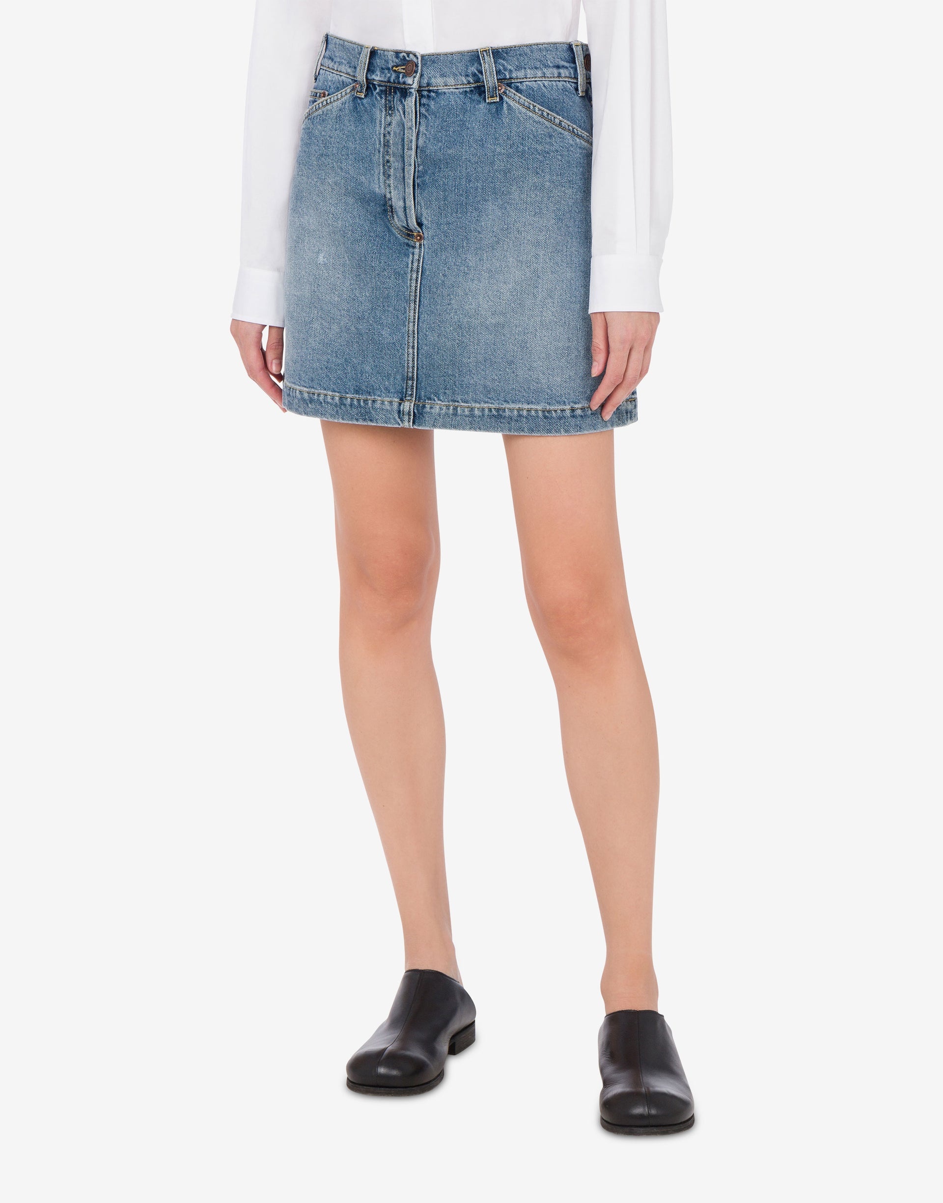 BLUE DENIM MINI SKIRT WITH BACK PATCH CUSTOMISED WITH ARCHIVE LOGO AND LAUREL WREATH. PRODUCT DETAILS REGULAR FIT - REGULAR WAIST - THREE FRONT POCKETS - BELT LOOPS AT THE WAIST - TWO BACK POCKETS - COVERED ZIP AND BUTTON CLOSURE FABRIC: 100% COTTON SKU: AEF251E J012405220285 FITTING & DIMENSIONS - MODEL HEIGHT: 180 CM - MODEL BUST: 80 CM - MODEL WAIST: 60 CM - MODEL HIPS: 89 CM - MODEL SIZE: 40