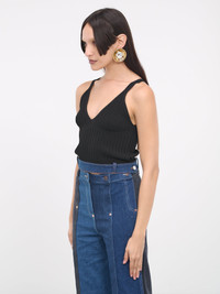 M05CH1NO JEANS top in black & blue, mixed-material construction, ribbed knit, v-neckline, sleeveless, shoulder straps, jeans waistband trim, belt loops, back logo patch, adjustable button fastening, straight hem, slim fit. Standard Sizing Model is 5'8" wearing size S. Bust: 32" Waist: 26" Hips: 34.5"