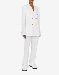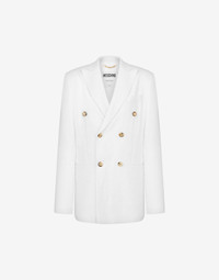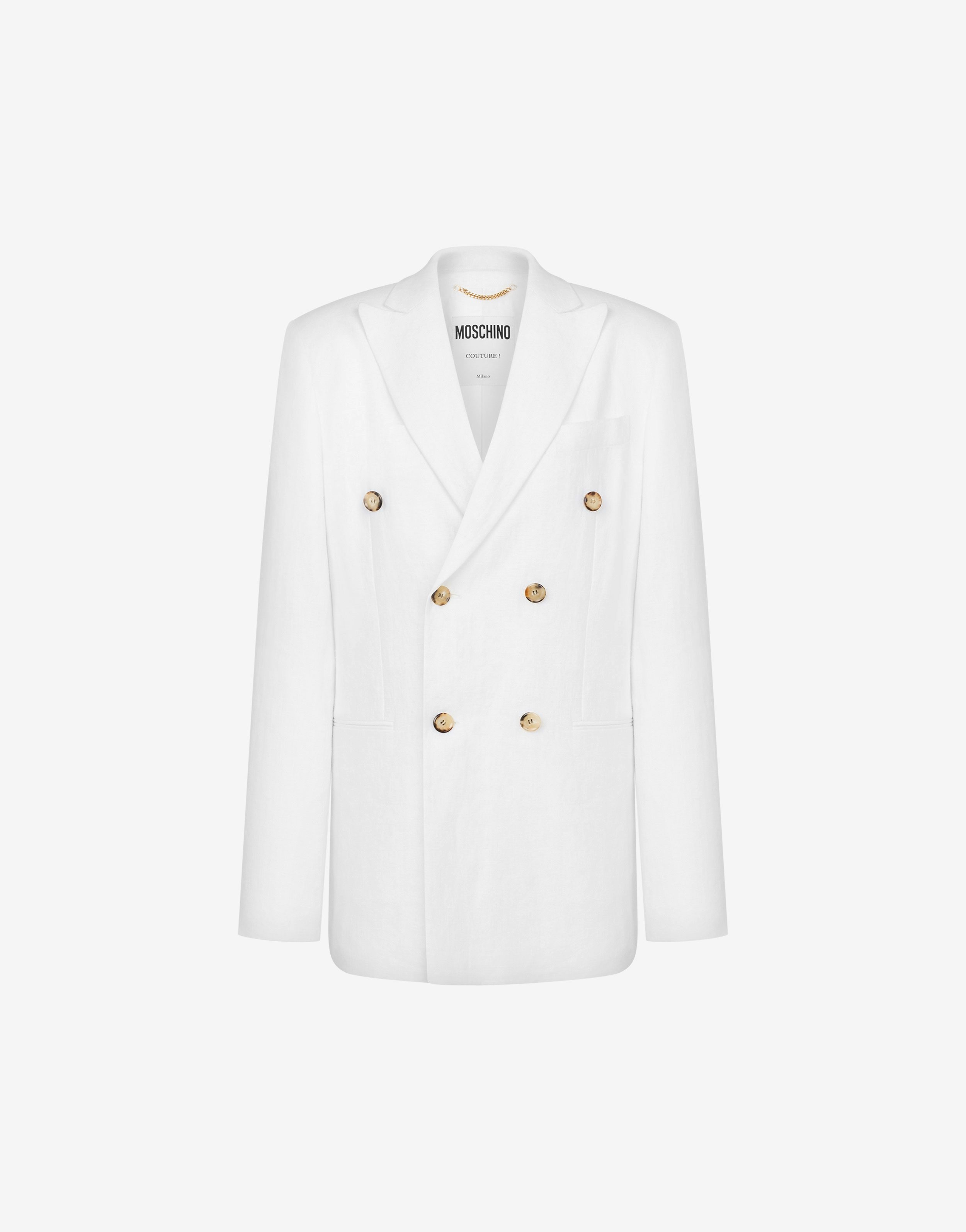DOUBLE-BREASTED LINEN JACKET WITH A STRAIGHT CUT. DECORATIVE ARCHIVE LOGO LAUREL CROWN BUTTON ON THE SLEEVE HEM. RELAXED FIT PEAK LAPEL THREE FRONT POCKETS BUTTONED SLEEVE HEM FRONT BUTTON CLOSURE PADDED SHOULDERS LINED TWO INTERNAL POCKETS FABRIC: 100% LINEN LINING: 60% CELLULOSE ACETATE, 40% CUPRO CODE: AEF251D 050504260001 FIT MODEL BUST SIZE: 80 CM MODEL HEIGHT: 180 CM MODEL HIPS: 89 CM MODEL SIZE: 40 CM MODEL WAIST: 60 CM