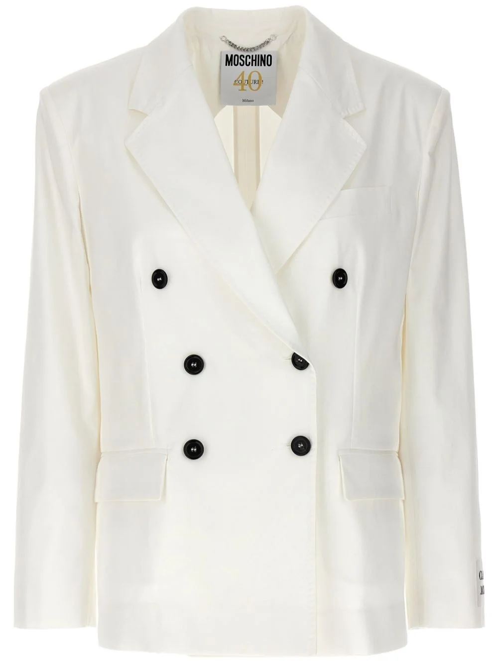 double-breasted blazer Highlights - White - Front button fastening - Buttoned cuffs - Chest welt pocket - Two front flap pockets Imported Composition Cotton 96%, Elastane 4%