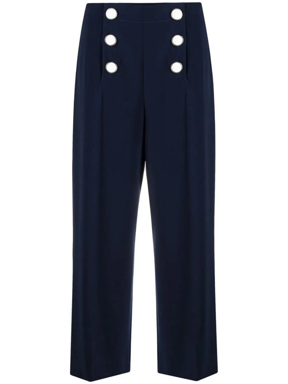 double breasted cropped trousers blue high waist double-breasted button fastening wide leg cropped Imported Composition Lining: Acetate 60%, Cupro 40% Outer: Polyester 90%, Spandex/Elastane 10% SIZE & FIT Model measurements Height 5 ft 10 in(1.77 m) Bust/Chest 31.49 in(80 cm) Hips 36.22 in(92 cm) Waist 22.44 in(57 cm) FittingInformation This piece fits true to size. We recommend you get your regular size Designed to be fitted at the waist and hips, loose over the leg Made with a mid-weight stretch fabric Washing instructions Dry Clean Only