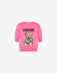 Pure cotton knitted top with logo insert and drawn-effect Moschino Teddy Bear. - Round neck - Balloon-look short sleeves Fabric:100% Cotton Code: AEF241E 092505025208 FIT - Model bust size : 82 - Model height : 1.78 cm - Model Hips : 88 cm - Model size : 40 - Model waist : 60 cm