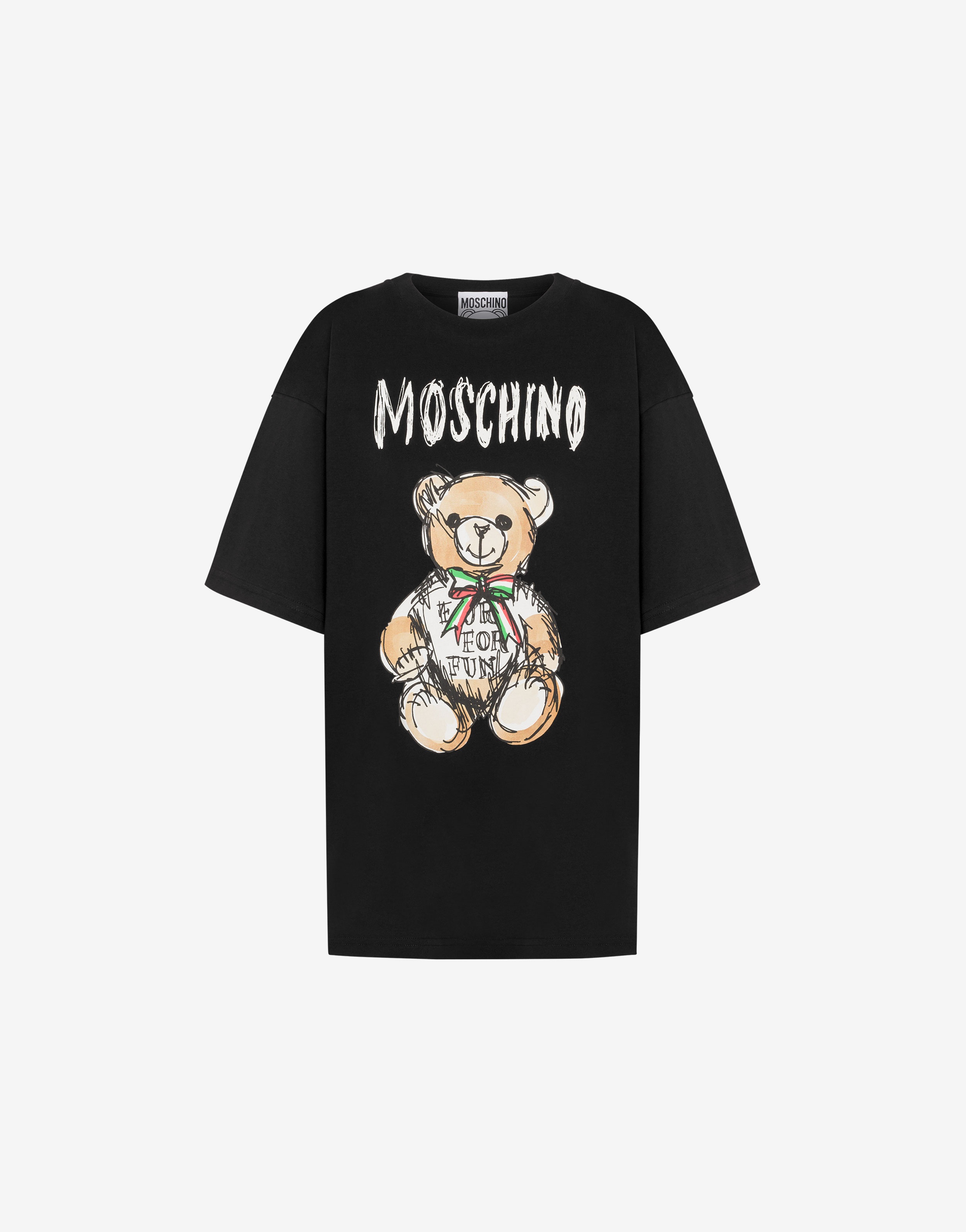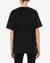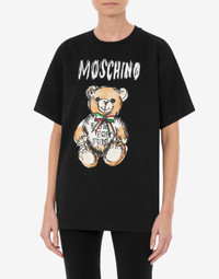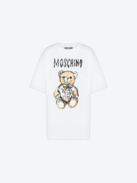Organic cotton jersey T-shirt with logo print and drawn-effect Moschino Teddy Bear. - Oversize fit - Print on the front - Short sleeves - Dropped shoulders Fabric:100% Cotton Code: AEF241E 070805411555 FIT - Oversize fit - Model bust size : 82 - Model height : 1.78 cm - Model Hips : 88 cm - Model size : 40 - Model waist : 60 cm