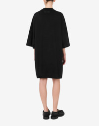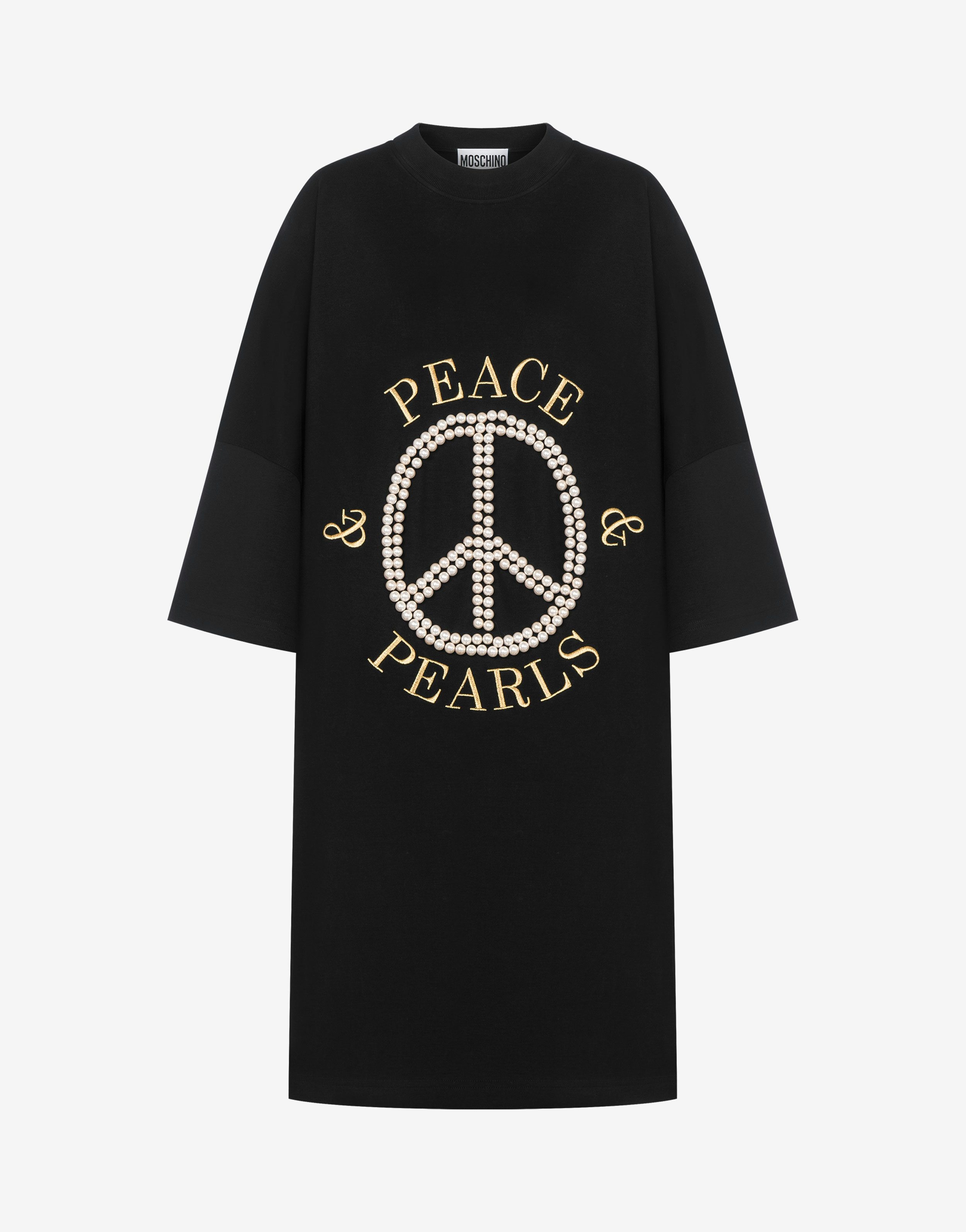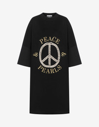 OVERSIZE DRESS IN COTTON INTERLOCK WITH AN ARCHIVAL PEACE SYMBOL DECORATION CREATED WITH WHITE PEARLS AND 'PEACE & PEARLS' EMBROIDERY IN GOLD THREAD. OVERSIZE FIT PEACE SYMBOL DECORATION WITH PEARLS THREAD EMBROIDERY CREW NECK SHORT AND OVERSIZED SLEEVES DROPPED SHOULDERS FABRIC: 100% COTTON CODE: AEF242D 043054423555