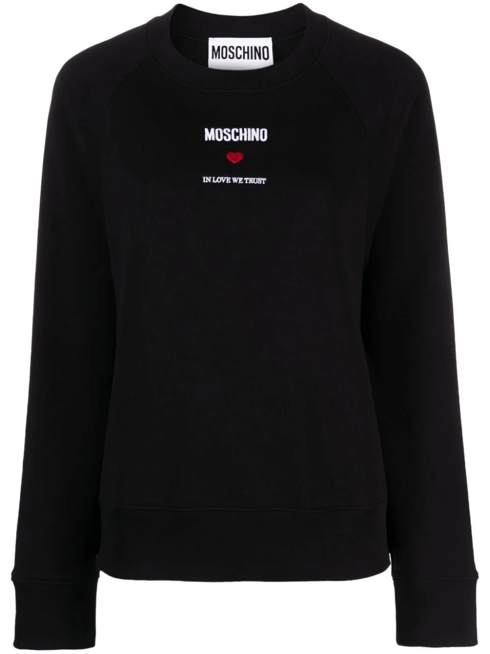embroidered-logo cotton sweatshirt Moschino's penchant for playful motifs is evidenced by this cotton sweatshirt. It arrives in a jet-black hue and plays host to an embroidered heart motif alongside logo lettering and a slogan that reads, "IN LOVE WE TRUST". Highlights - Black - Cotton - Jersey texture - Embroidered logo and slogan to the front - Heart motif embroidery - Round neck - Long raglan sleeves - Ribbed cuffs and hem - Short side zip fastening slits - French terry lining - Straight hem Imported Composition Cotton 100% SIZE & FIT Model measurements Height 5 ft 11 in(1.8 m) Bust/Chest 34.25 in(87 cm) Hips 35.82 in(91 cm) Waist 24.8 in(63 cm) FittingInformation Designed for a relaxed fit, this piece allows for comfort and movement when worn Made from a midweight non-stretch fabric, this piece offers minimal elasticity when worn This piece fits true to size – take your usual size
