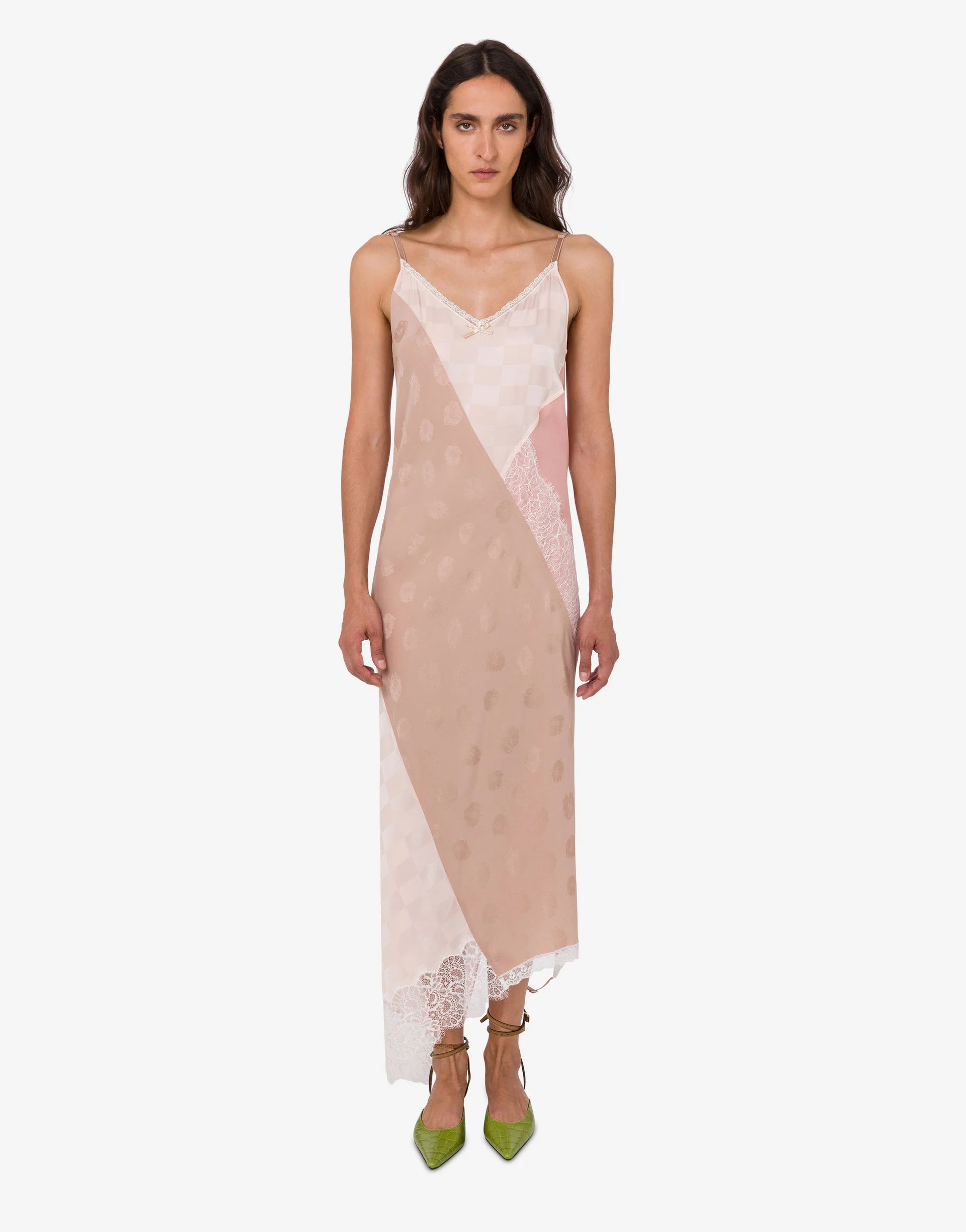 THE FALL/WINTER 2025 PRE-COLLECTION PRESENTS A DRESS MADE FROM SILK BLEND PATCHWORK WITH CONTRASTING JACQUARD EMBROIDERY. PRODUCT DETAILS - LACE EMBROIDERY - SMALL BOW ON THE FRONT - V-NECKLINE - THIN ADJUSTABLE STRAPS - ASYMMETRICAL HEM FABRIC: 79% VISCOSE, 21% SILK SKU: AEF252E A040355352169