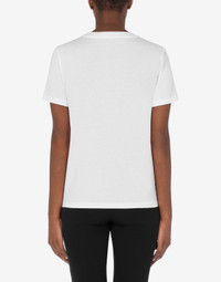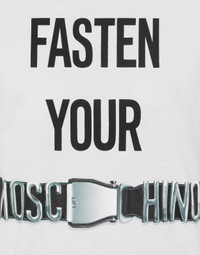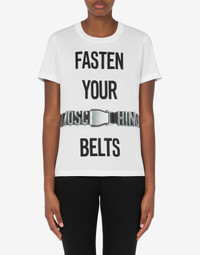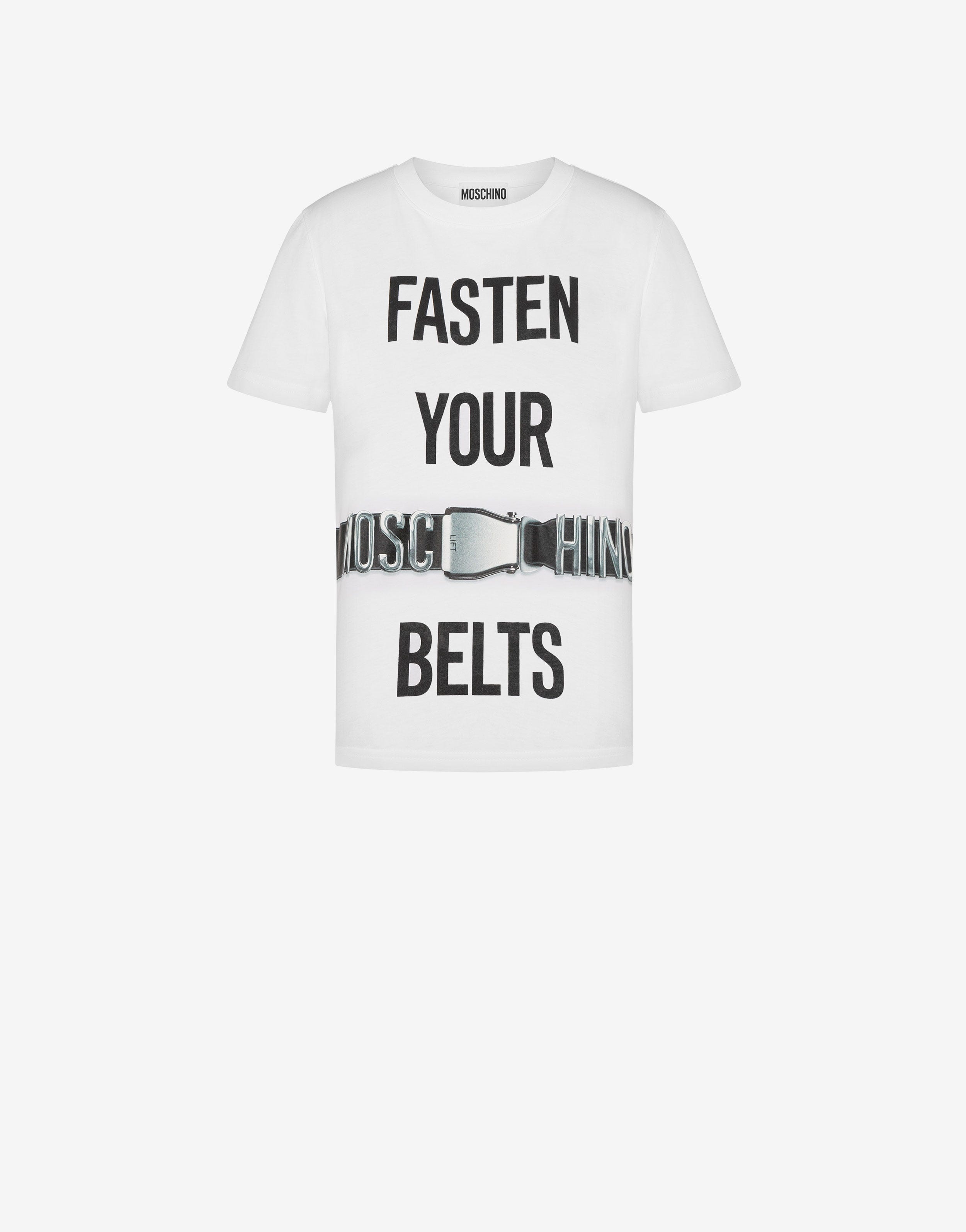 Organic cotton jersey T-shirt with the Fasten Your Belts print on the front. - Regular fit - Moschino-branded aircraft belt print on the front - Short sleeves Fabric:100% Cotton Code: AEF231E 071105415001 FIT - Regular fit - Model bust size : 82 - Model height : 1.78 cm - Model Hips : 88 cm - Model size : 40 - Model waist : 60 cm