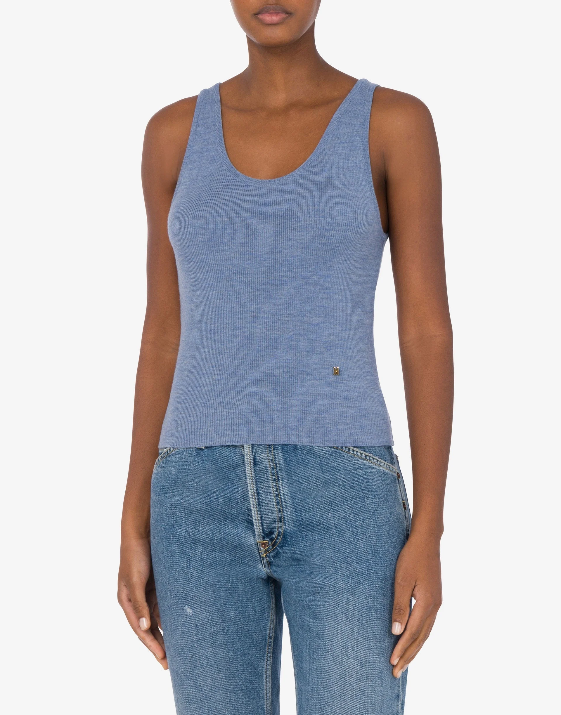 SUPERFINE WOOL AND SILK TANK TOP WITH SMALL MOSCHINO LETTER M IN GOLD-TONE GALVANISED METAL. PRODUCT DETAILS REGULAR FIT - METAL M LETTER - ROUND NECKLINE - SLEEVELESS FABRIC: 70% PURE WOOL, 30% SILK SKU: AEF251E A088205010307 FITTING & DIMENSIONS - MODEL HEIGHT: 180 CM - MODEL BUST: 80 CM - MODEL WAIST: 60 CM - MODEL HIPS: 89 CM - MODEL SIZE: 40