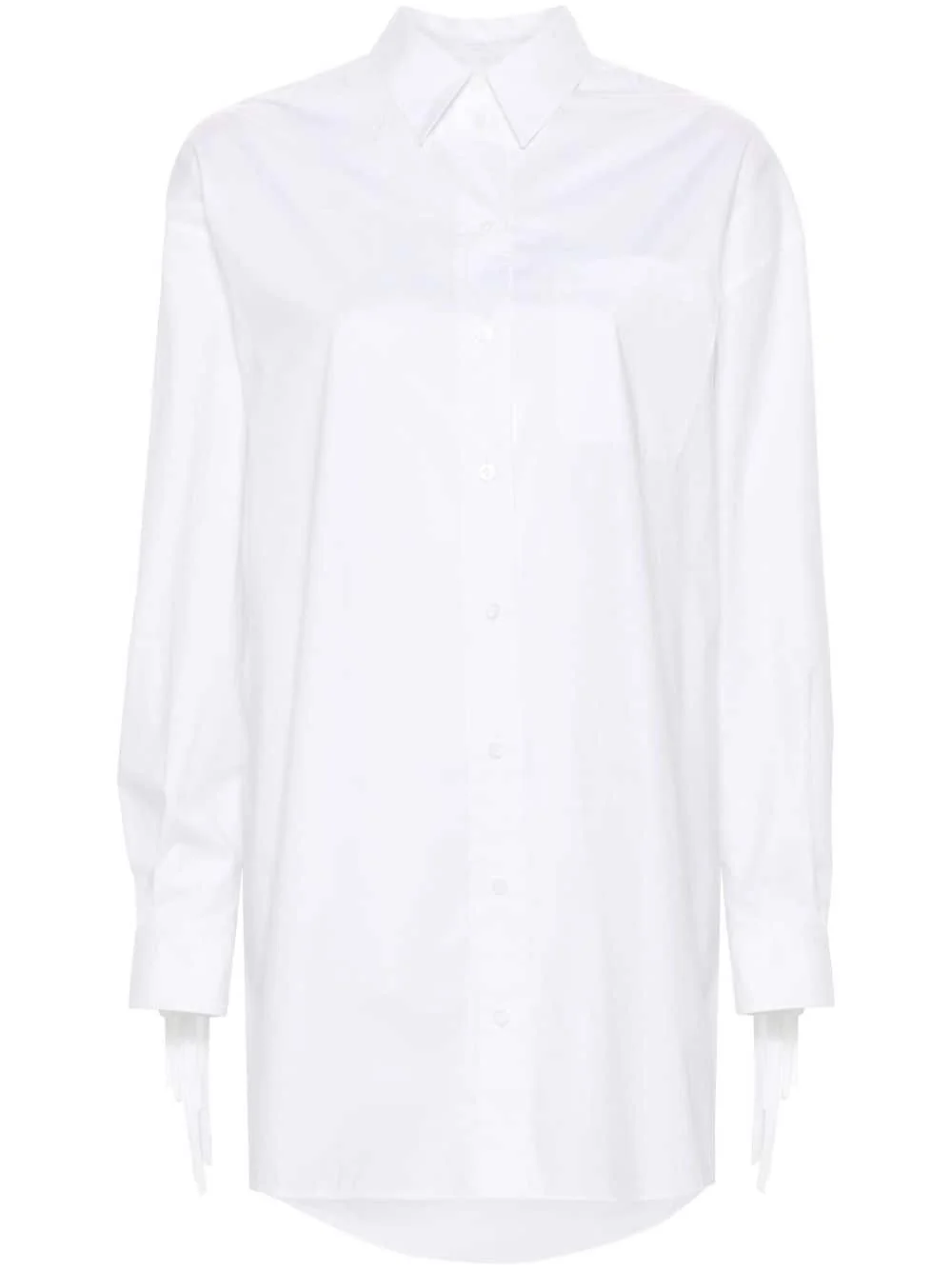 fringed shirt Highlights - White - Cotton blend - Poplin texture - Fringe detailing - Front button fastening - Spread collar - Long sleeves - Buttoned cuffs - Chest patch pocket - Curved hem Made in Italy Composition Cotton 94%, Spandex/Elastane 6% SIZE & FIT Model measurements Height 5 ft 9 in(1.75 m) Bust/Chest 34.64 in(88 cm) Hips 36.61 in(93 cm) Waist 26.37 in(67 cm) FittingInformation Designed to be unstructured, offering a loose fit throughout Made from a midweight stretch fabric, this piece offers elasticity and flexibility when worn