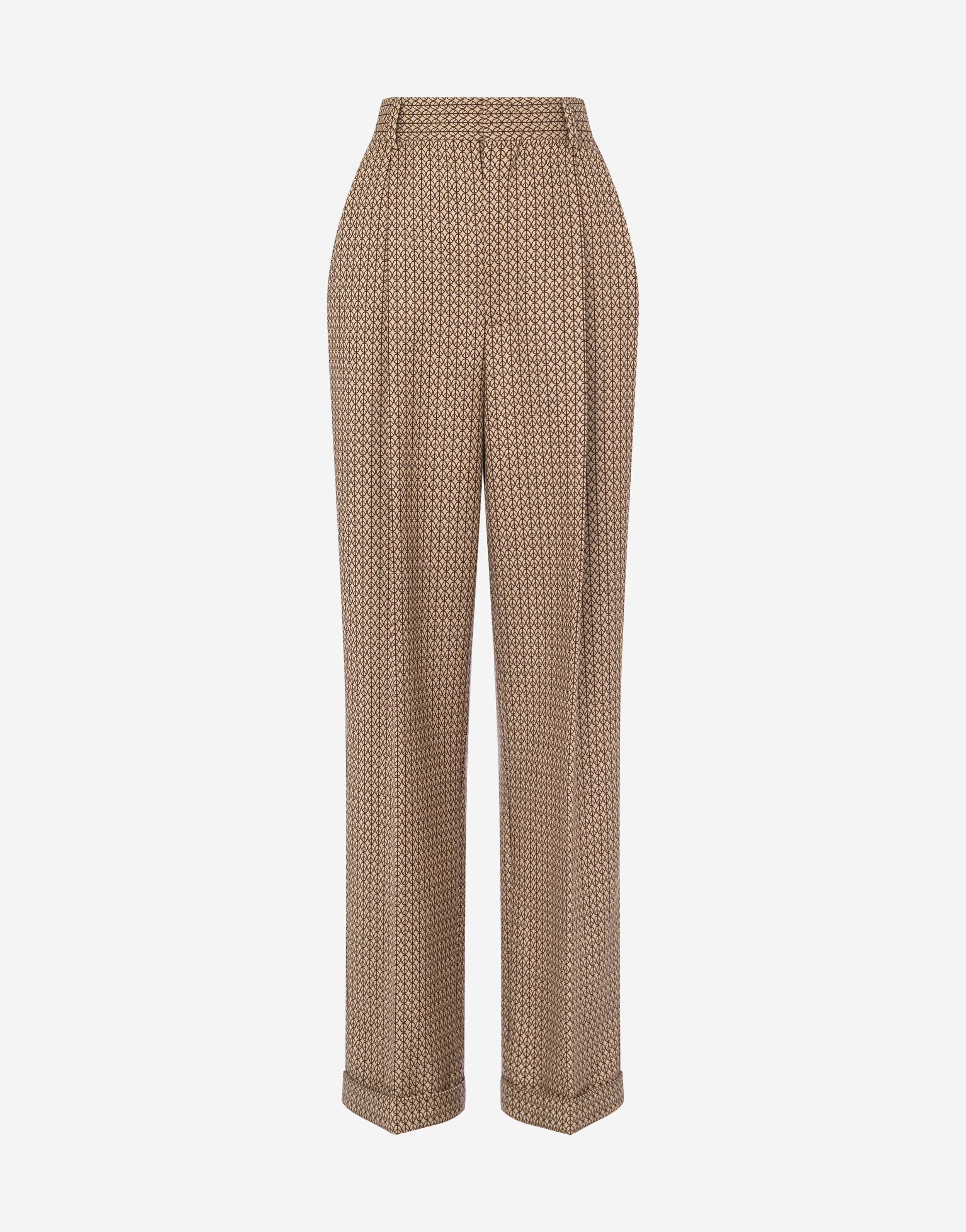 OVERSIZE PANTS IN WOOL WITH JACQUARD EMBROIDERY INSPIRED BY THE CLASSIC ARCHIVAL PEACE SYMBOL PATTERN ALL OVER. THE SARTORIAL CUT INSPIRED BY MEN'S FASHION IS EMPHASIZED BY THE FRONT PLEATS. RELAXED FIT JACQUARD PEACE SYMBOL EMBROIDERY TWO FRENCH POCKETS BELT LOOPS BACK WELT POCKET CONCEALED ZIP AND HOOK CLOSURE HEM CUFF FABRIC: 100% PURE WOOL LINING: 60% CELLULOSE ACETATE, 40% VISCOSE CODE: AEF242D 030954181081