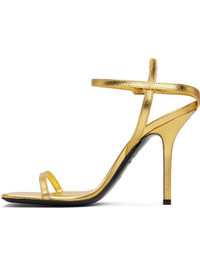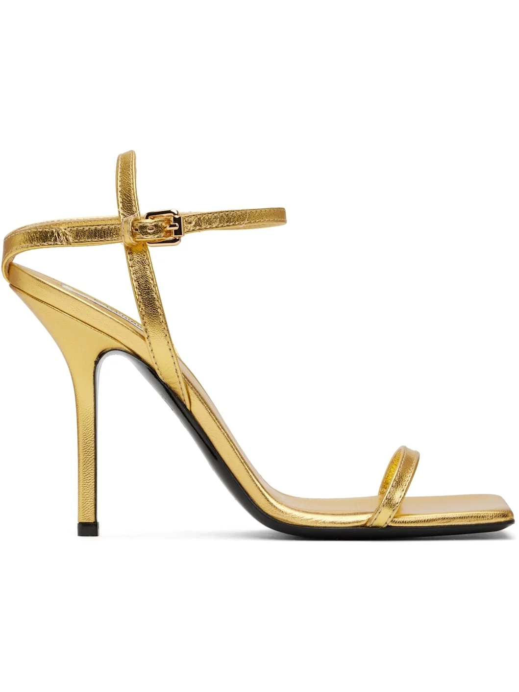Grained lambskin heeled sandals in metallic-gold tone. · Square toe · Straps at vamp · Pin-buckle ankle strap · Logo patch at padded goatskin footbed · Covered stiletto heel with rubber injection · Polished leather sole · Heel: H4" Supplier color: Gold Upper: lambskin. Sole: leather, rubber. Made in Italy 251720F125002