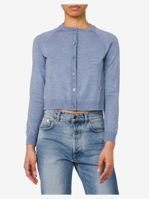 SHORT CARDIGAN IN ULTRAFINE WOOL AND SILK WITH SMALL GOLD-PLATED MOSCHINO LETTER M. PRODUCT DETAILS REGULAR FIT - METAL LETTER M - NECKLINE - BUTTON FRONT CLOSURE FABRIC: 70% PURE WOOL, 30% SILK SKU: AEF251E A093205010486 FITTING & DIMENSIONS - MODEL HEIGHT: 180 CM - MODEL BUST: 80 CM - MODEL WAIST: 60 CM - MODEL HIPS: 89 CM - MODEL SIZE: 40