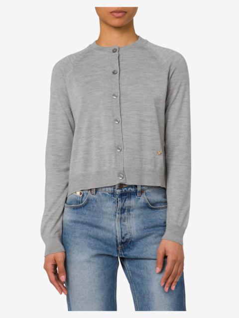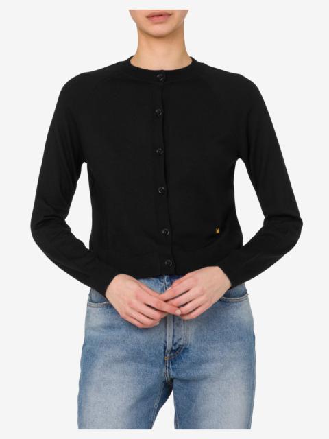SHORT CARDIGAN IN ULTRAFINE WOOL AND SILK WITH SMALL GOLD-PLATED MOSCHINO LETTER M. PRODUCT DETAILS REGULAR FIT - METAL LETTER M - NECKLINE - BUTTON FRONT CLOSURE FABRIC: 70% PURE WOOL, 30% SILK SKU: AEF251E A093205010555 FITTING & DIMENSIONS - MODEL HEIGHT: 180 CM - MODEL BUST: 80 CM - MODEL WAIST: 60 CM - MODEL HIPS: 89 CM - MODEL SIZE: 40