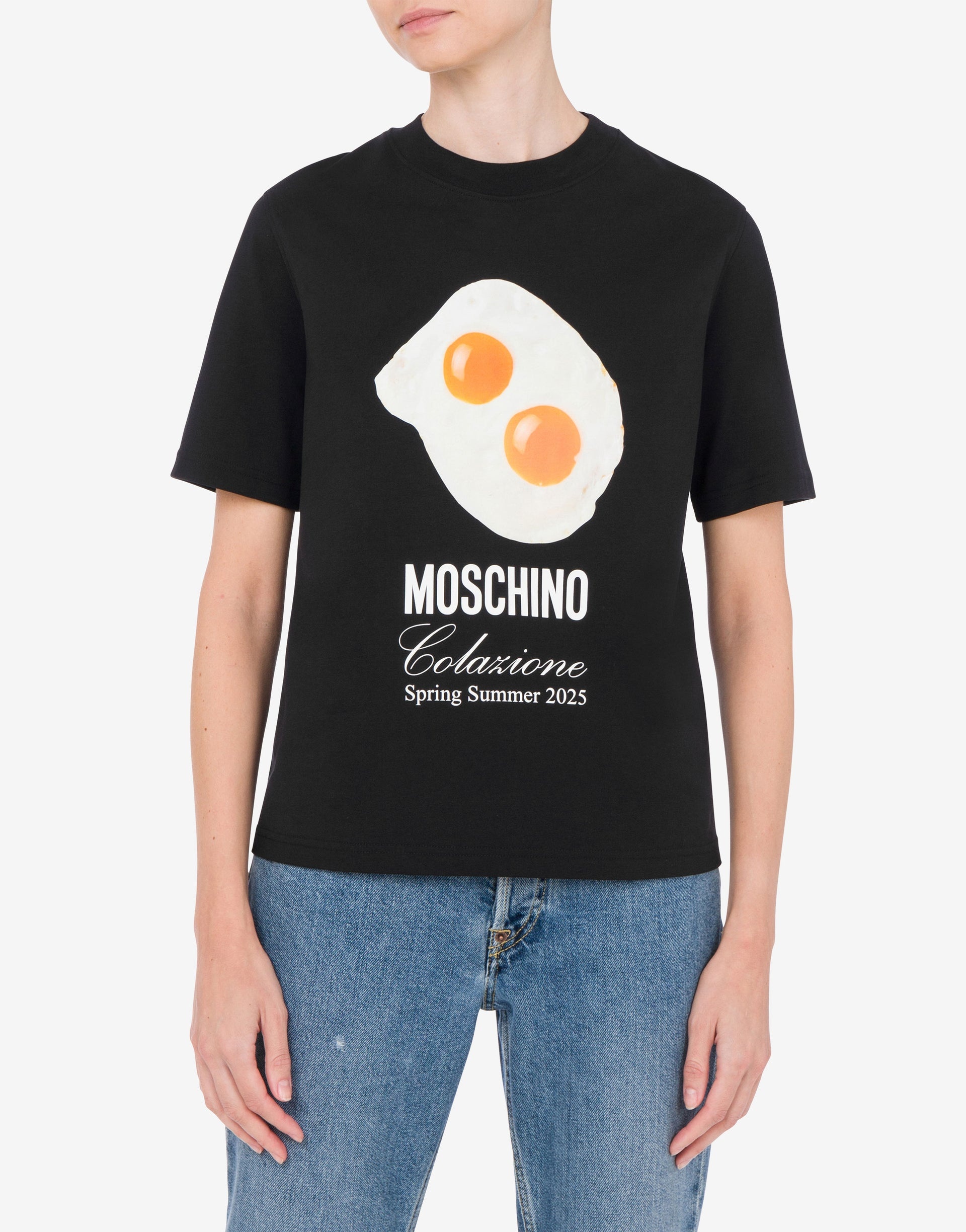 ORGANIC COTTON JERSEY T-SHIRT WITH EGG PRINT AND MOSCHINO BREAKFAST LOGO. PRODUCT DETAILS REGULAR FIT - SHORT SLEEVES FABRIC: 100% COTTON SKU: AEF251E A070405411555 FITTING & DIMENSIONS - MODEL HEIGHT: 180 CM - MODEL BUST: 80 CM - MODEL WAIST: 60 CM - MODEL HIPS: 89 CM - MODEL SIZE: 40