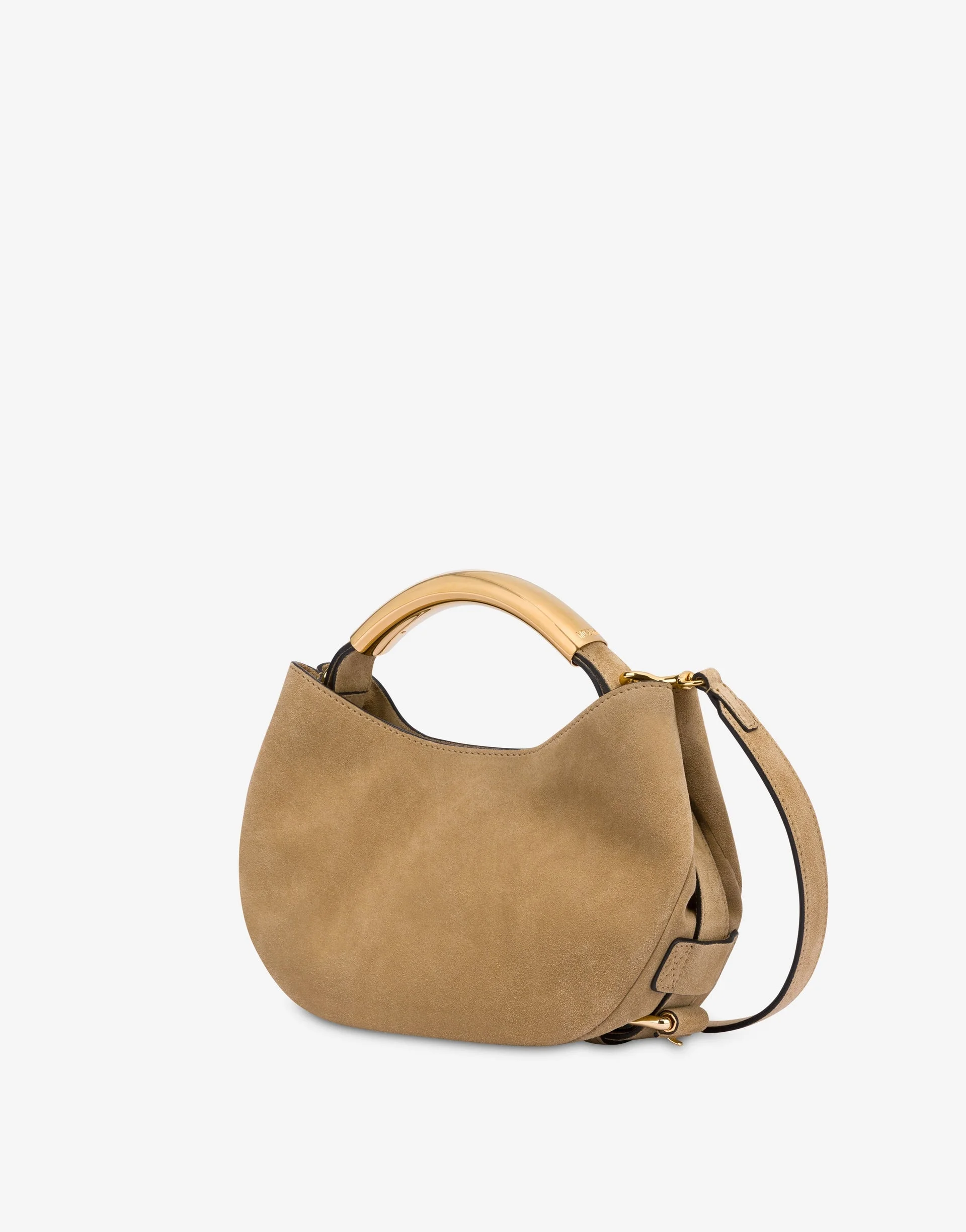 SMALL HOBO BAG IN SUEDE, SOFT AND VERY LIGHTWEIGHT. THE TUBULAR METAL HANDLE CREATES A UNIQUE AND CAPTIVATING DESIGN WITH REFINED ELEGANCE, AND THE ADJUSTABLE BELT WRAPPING AROUND THE BAG IS HIGHLIGHTED BY THE LETTERING LOGO INTERWOVEN IN THE DESIGN. AVAILABLE EXCLUSIVELY ONLINE. PRODUCT DETAILS - LETTERING LOGO CREATED WITH METAL LETTERS - HANDLE EMBELLISHED WITH SIDE ENGRAVINGS - REMOVABLE AND ADJUSTABLE STRAP - MULTIPLE CARRY OPTIONS: HAND, SHOULDER, CROSSBODY - HIDDEN MAGNETIC CLOSURE - LINED INTERIOR WITH SMALL PATCH POCKET LINING: 100% COTTON - UPPER: 100% CALFSKIN SKU: POLMC4177PP1MOF0104 FITTING & DIMENSIONS - DEPTH: 8 CM - WIDTH: 21 CM - HEIGHT: 18.5 CM