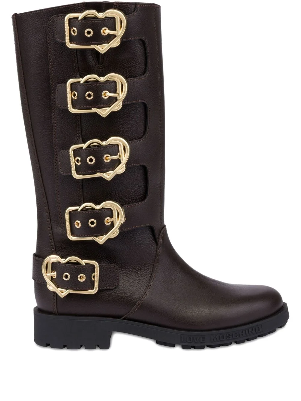 heart-buckle leather boots Highlights - Brown - Calf leather - Heart-shaped buckles - Multiple buckles - Flat sole - Block heel Imported Composition Sole: Rubber 100% Lining: Calf Leather 100% Outer: Calf Leather 100%