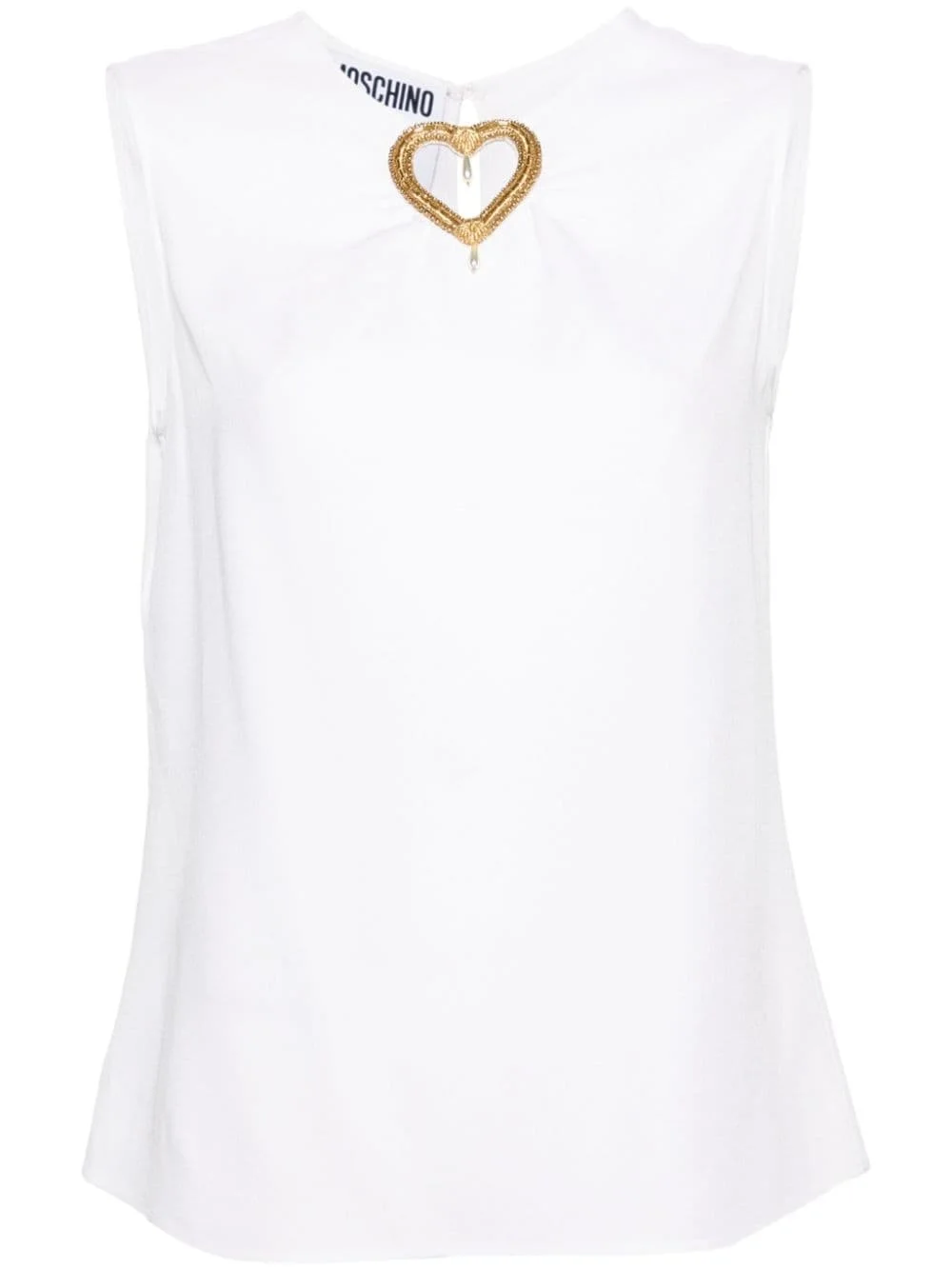 heart cut-out sleeveless blouse This white Moschino blouse is characterised by its understated, sleeveless design. It spotlights the gold-tone heart plaque that decorates its rounded neckline. Highlights - White - Crepe texture - Heart applique detail - Cut-out detailing - Pearl detailing - Round neck - Rear button fastening - Sleeveless - Straight hem Made in Italy Composition Acetate 70%, Viscose 30% SIZE & FIT Model measurements Height 5 ft 11 in(1.8 m) Bust/Chest 31.49 in(80 cm) Hips 36.22 in(92 cm) Waist 25.59 in(65 cm) Washing instructions Dry Clean Only