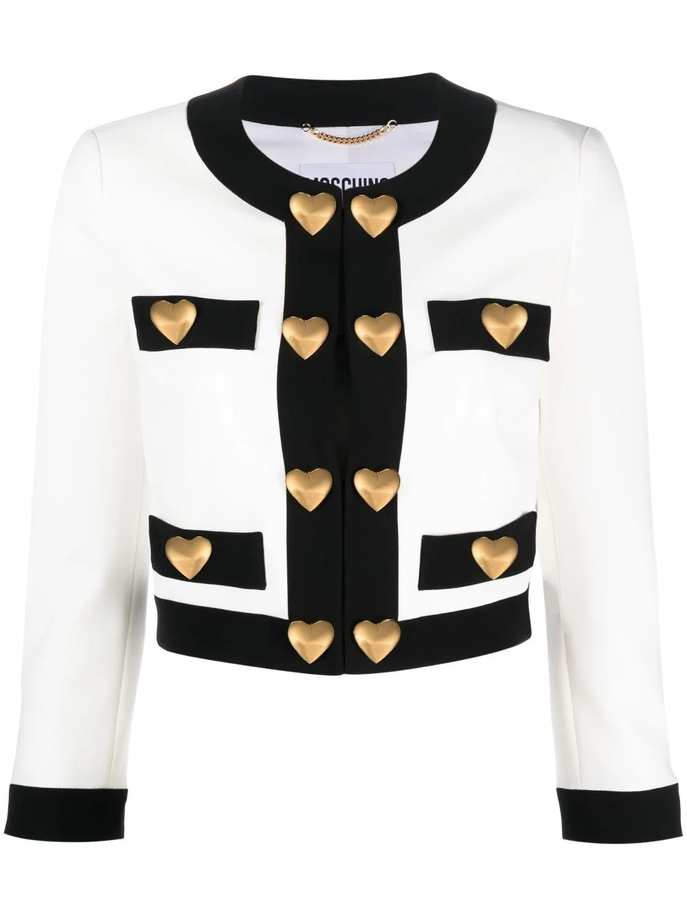 heart-embellished cropped jacket Highlights - Black/white - Heart motif - Applique detail - Gold-tone hardware - Contrasting border - Round neck - Concealed front fastening - Long sleeves - Buttoned cuffs - Straight hem - Cropped Made in Italy Composition Lining: Acetate 83%, Silk 17% Outer: Polyester 89%, Elastane 11% SIZE & FIT Model measurements Height 5 ft 11 in(1.8 m) Bust/Chest 31.49 in(80 cm) Hips 35.43 in(90 cm) Waist 24.4 in(62 cm) FittingInformation Designed for a slim fit that sits just away from the body offering a close yet comfortable fit The internal shoulder pads offer a structured shape Made from a midweight stretch fabric, this piece offers elasticity and flexibility when worn This piece fits true to size – take your usual size Washing instructions Dry Clean Only