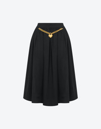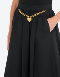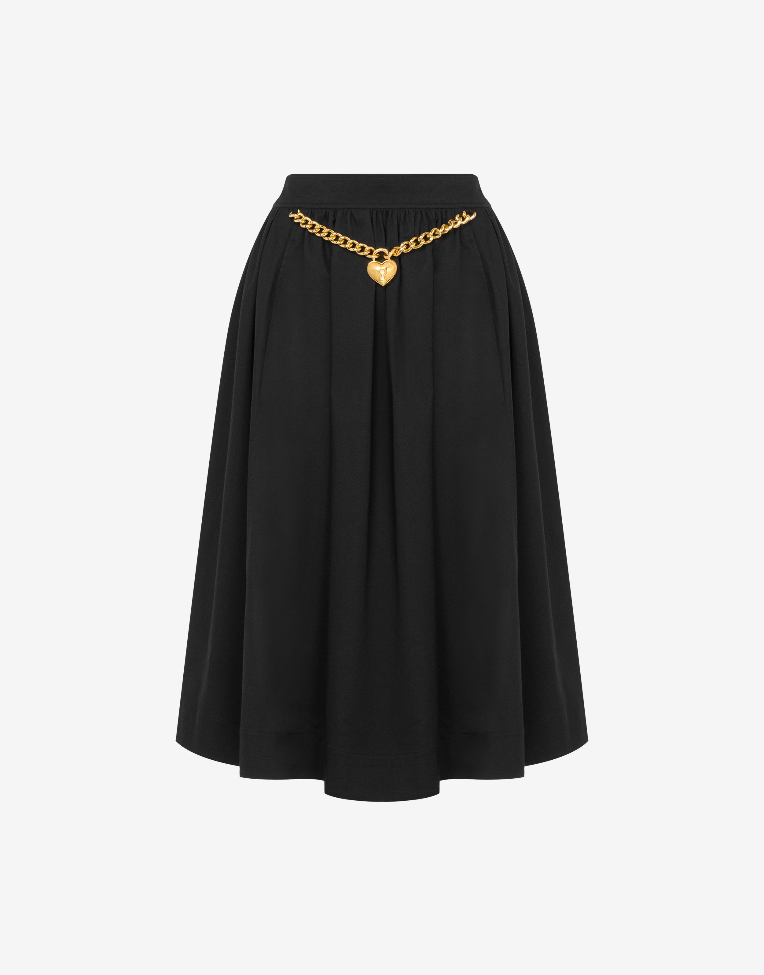 Stretch cotton cloth A-line skirt with decorative chain and gold-electroplated heart-shaped padlock charm. - A-line Fit - Metal chain and heart charm - High waist - Flared fit - Two front pockets - Zip fastening on the back Fabric:97% Cotton, 3% Elastan Code: AEF241E 011405300555 FIT - A-line Fit - Model bust size : 82 - Model height : 1.78 cm - Model Hips : 88 cm - Model size : 40 - Model waist : 60 cm
