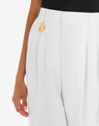 Stretch crêpe trousers with pleats on the front and gold-electroplated heart-shaped padlock charm. - Relaxed fit - High waist - Metal charm - Belt loop detail at the waist - Two back pockets - Fastening on the front with covered zip and concealed hook Fabric:12% Elastan, 88% Polyester Lining:60% Cellulose acetate, 40% Cupro Code: AEF241E 031605240001 FIT - Relaxed fit - Model bust size : 82 - Model height : 1.78 cm - Model Hips : 88 cm - Model size : 40 - Model waist : 60 cm