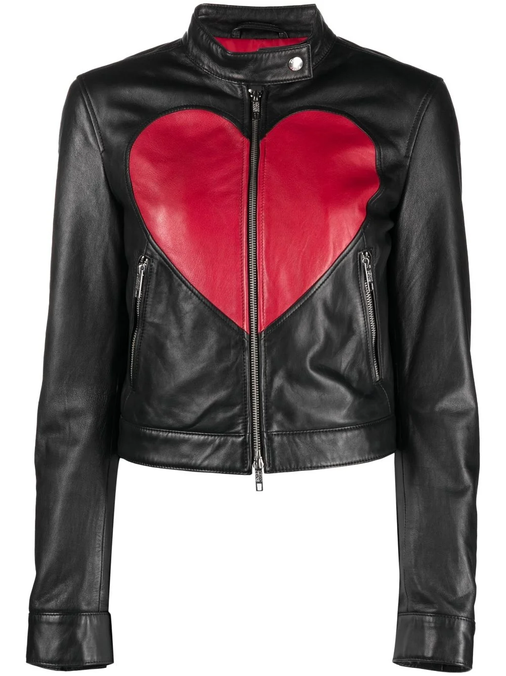 heart-print leather jacket Highlights - Black/bright red - Sheepskin - Heart print - Press-stud fastening collar - Front two-way zip fastening - Long sleeves - Press-stud fastening cuffs - Two side zip-fastening pockets Imported Composition Outer: Sheepskin 100% Lining: Polyester 100% Washing instructions Specialist Cleaning