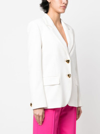 heart-shaped buttons blazer white gold-tone hardware heart-shaped buttons two side flap pockets notched lapels long sleeves buttoned cuffs curved hem Made in Italy Composition Outer: Polyester 89%, Polyurethane 11% Lining: Acetate 83%, Silk 17% SIZE & FIT Model measurements Height 5 ft 10 in(1.78 m) Bust/Chest 33.07 in(84 cm) Hips 35.82 in(91 cm) Waist 25.98 in(66 cm) FittingInformation This piece fits true to size. We recommend you get your regular size Cut for a slim fit Made with a mid-weight non-stretch fabric Washing instructions Dry Clean Only