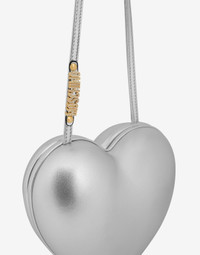 SILVER HEART-SHAPED SHOULDER BAG WITH LOGO LETTERING AND RHINESTONES ON THE HANDLE. LOGO LETTERING WITH RHINESTONES APPLIED ON THE HANDLE RIGID STRUCTURE HANDLE FOR SHOULDER PORTABILITY MAGNETIC CLOSURE FABRIC: 100% SHEEPSKIN CODE: AEF2427 733080112600 FIT DEPTH: 8 CM HEIGHT: 18 CM WIDTH: 18 CM