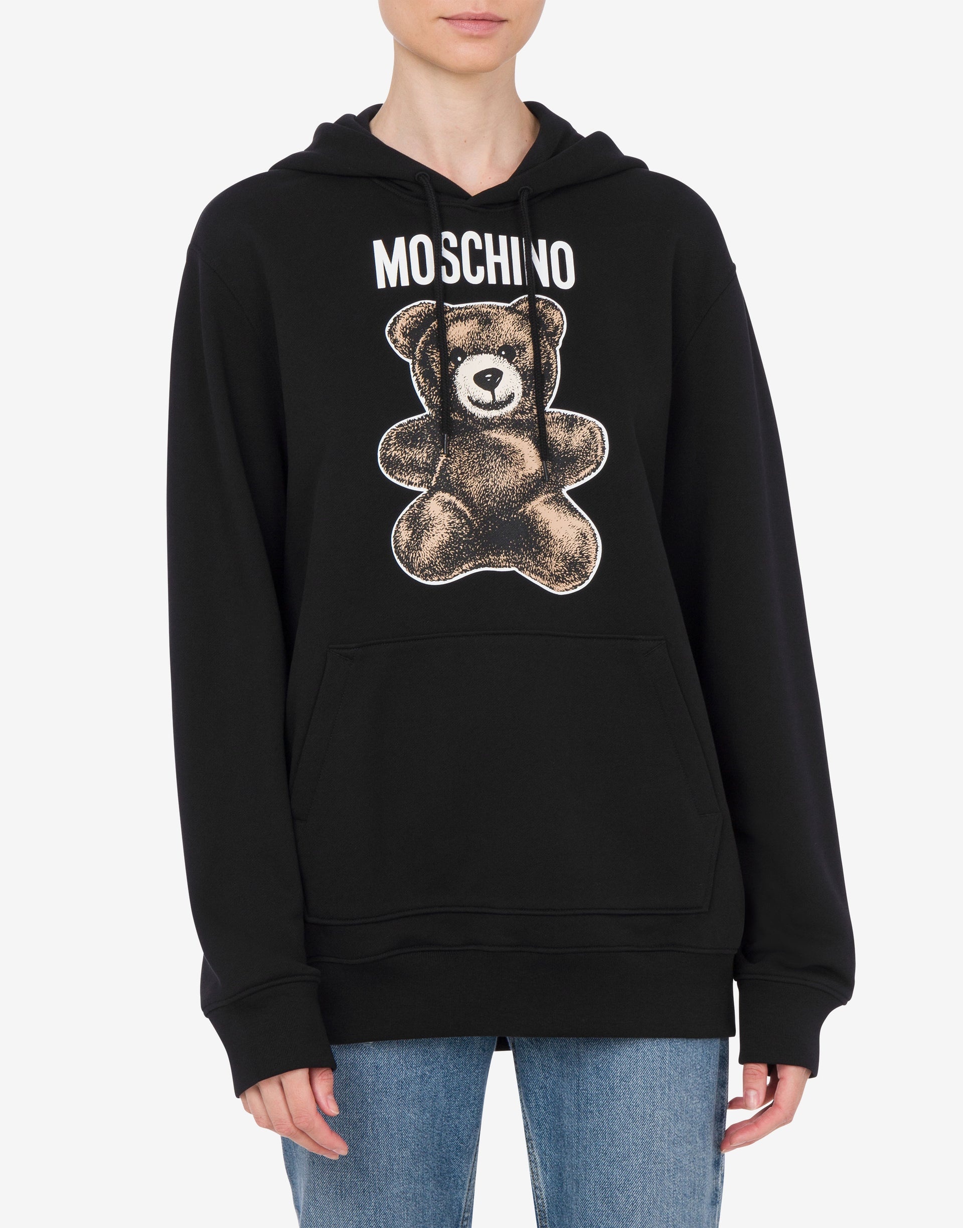 OVERSIZED ORGANIC COTTON HOODIE WITH MOSCHINO TEDDY BEAR PRINT ON THE FRONT. PRODUCT DETAILS OVERSIZE FIT - LOGO PRINT - DRAWSTRING HOOD - FRONT POCKET - DROPPED SHOULDERS FABRIC: 100% COTTON SKU: AEF251E V170205281555 FITTING & DIMENSIONS - MODEL HEIGHT: 180 CM - MODEL BUST: 80 CM - MODEL WAIST: 60 CM - MODEL HIPS: 89 CM - MODEL SIZE: 40