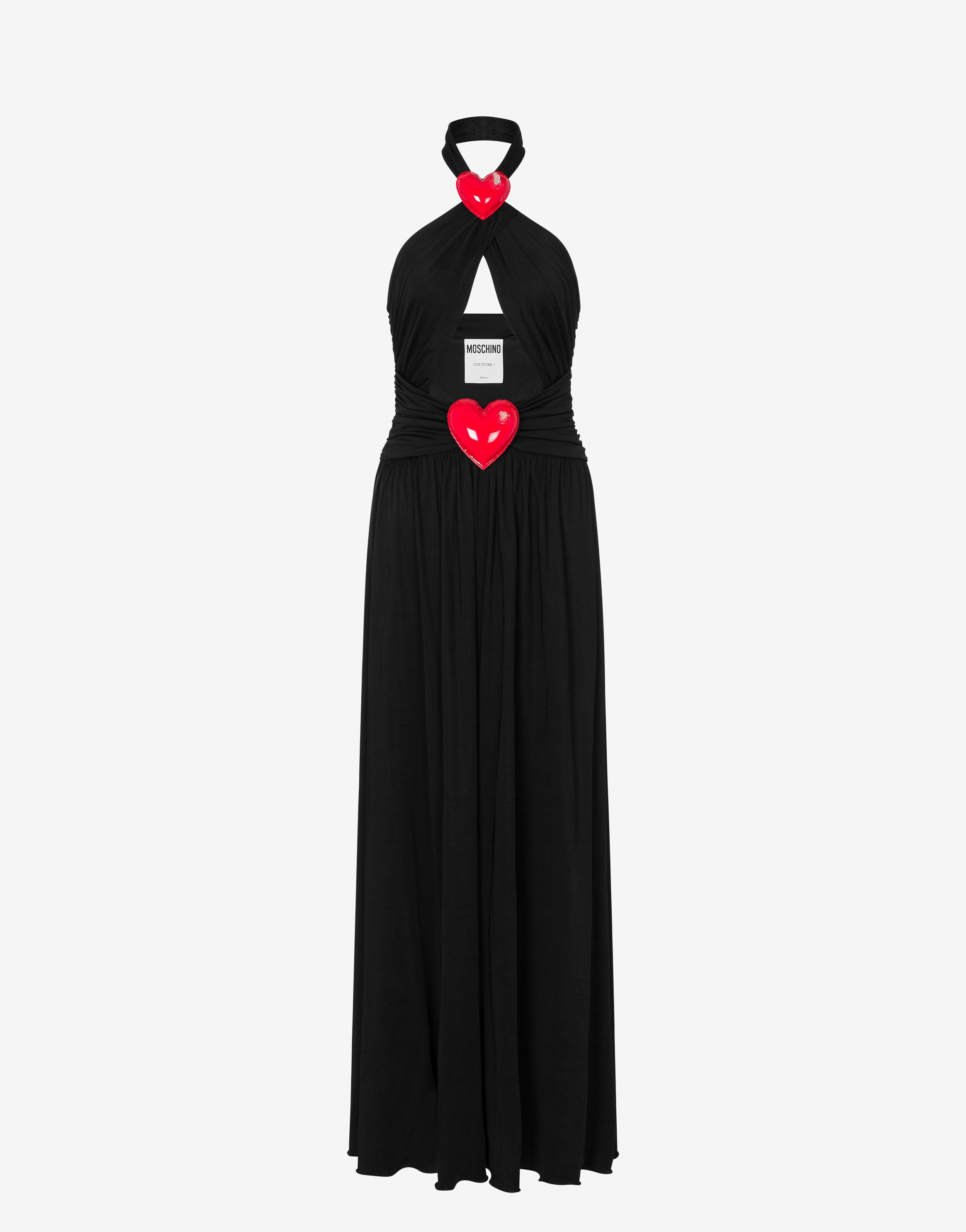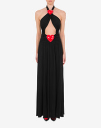 Long fluid viscose organzine dress with cut-out on the front and inflatable-effect red heart detail. - Regular fit - Red hearts with logo and decorative air valve - Halterneck - Neck fastening on the back - Sleeveless - Concealed zip fastening on the side - Inner bodysuit with hook-and-eye fastening Fabric:100% Viscose Lining:60% Cellulose acetate, 40% Cupro Code: AEF231D 040904390555 FIT - Regular fit - Model bust size : 82 - Model height : 1.78 cm - Model Hips : 88 cm - Model size : 40 - Model waist : 60 cm