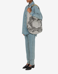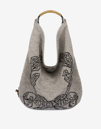 SHETLAND WOOL HOBO BAG, LARGE AND WITH VERY LIGHT PORTABILITY, FEATURING A MAXI EMBROIDERED ARCHIVE LOGO LAUREL CROWN. THE TUBULAR METAL HANDLE CREATES A UNIQUE AND CAPTIVATING DESIGN OF REFINED ELEGANCE. TWO ADJUSTABLE BELTS WRAP AROUND THE BAG. LARGE SIZE HANDLE EMBELLISHED WITH SIDE ENGRAVINGS LEATHER DETAILS HIDDEN MAGNET CLOSURE LINED INTERIOR WITH ZIP POCKET AND SMALL APPLIED POCKET FABRIC: 100% PURE WOOL CODE: AEF2422 759582241501 FIT DEPTH: 16 CM HEIGHT: 55 CM WIDTH: 50 CM