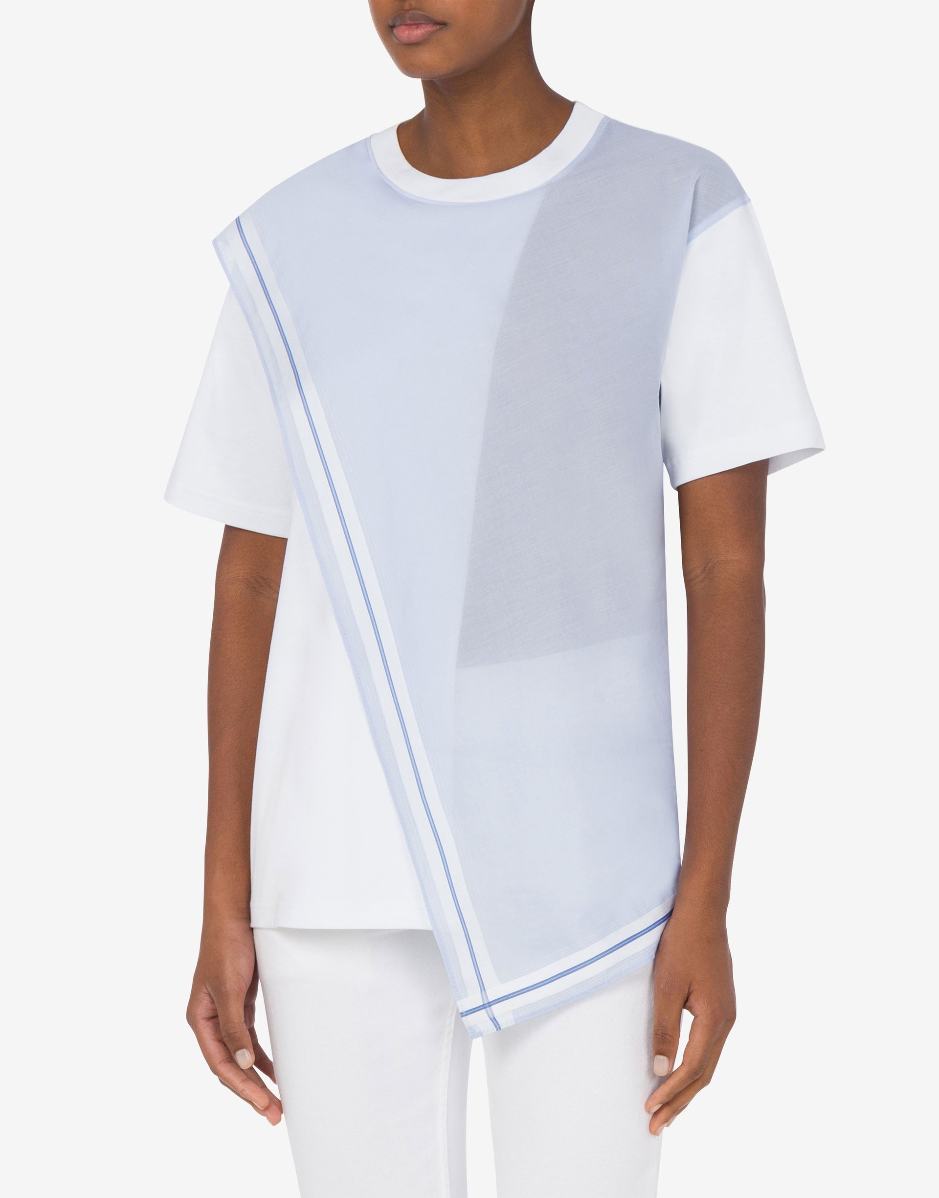 COTTON INTERLOCK T-SHIRT WITH JACQUARD PANEL ON COTTON POPLIN IN HANDKERCHIEF DESIGN. PRODUCT DETAILS REGULAR FIT - JACQUARD EMBROIDERY - SHORT SLEEVES - ASYMMETRIC HEM FABRIC: 100% COTTON SKU: AEF251E A070505422001 FITTING & DIMENSIONS - MODEL HEIGHT: 180 CM - MODEL BUST: 80 CM - MODEL WAIST: 60 CM - MODEL HIPS: 89 CM - MODEL SIZE: 40