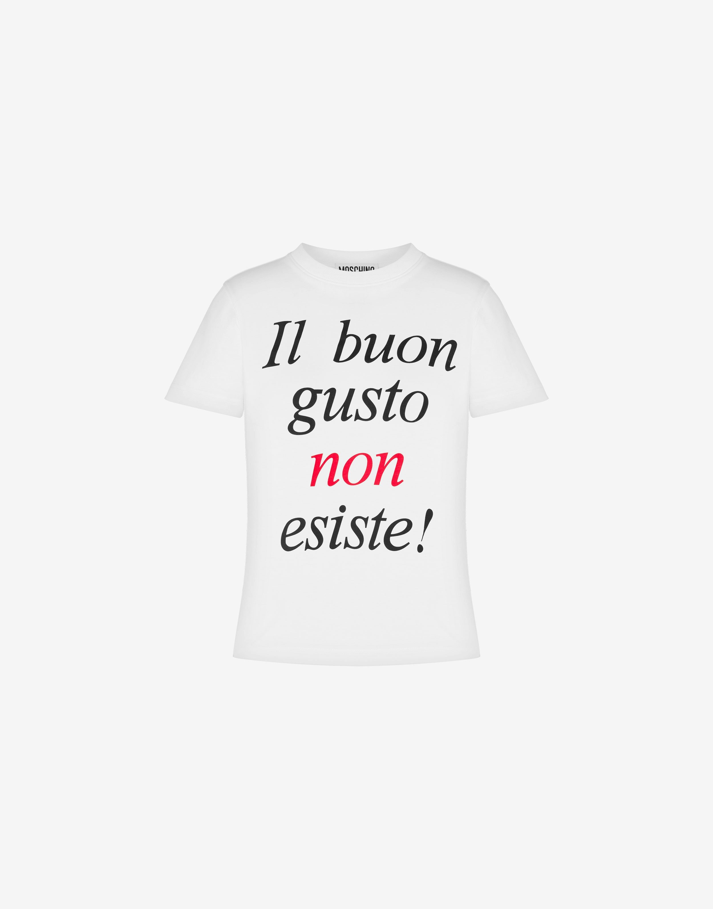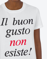 Organic cotton jersey T-shirt with Il Buon Gusto Non Esiste! print on the front. - Regular fit - Print on the front - Small logo print on the back - Short sleeves Fabric:100% Cotton Code: AEF241D 070904411001 FIT - Regular fit - Model bust size : 82 - Model height : 1.78 cm - Model Hips : 88 cm - Model size : 40 - Model waist : 60 cm