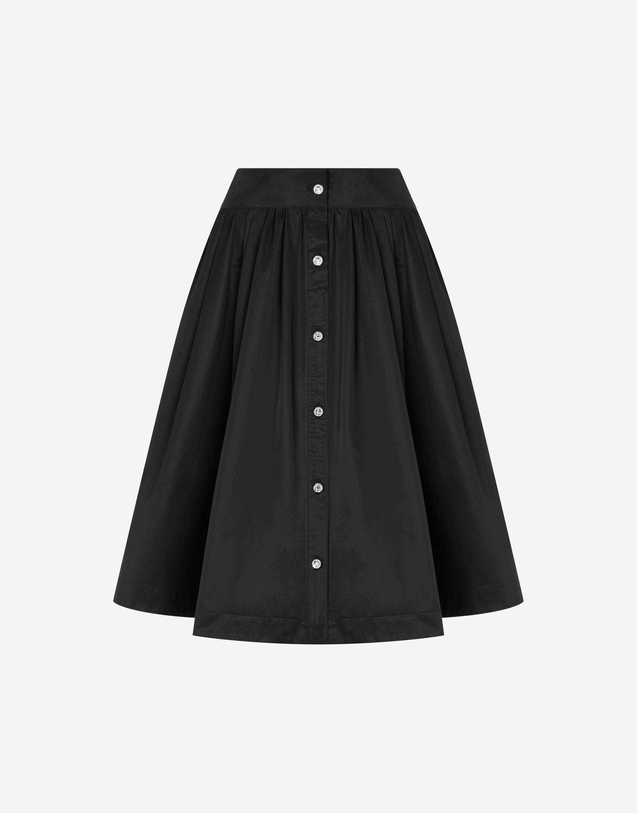 Cotton and nylon poplin full skirt with jewel buttons on the front and Classic Skirt patch embroidered on the back. - A-line Fit - High waist - Two side pockets - Front button fastening Fabric:59% Cotton, 41% Polyamide Code: AEF241D 012404300555 FIT - A-line Fit - Model bust size : 82 - Model height : 1.78 cm - Model Hips : 88 cm - Model size : 40 - Model waist : 60 cm